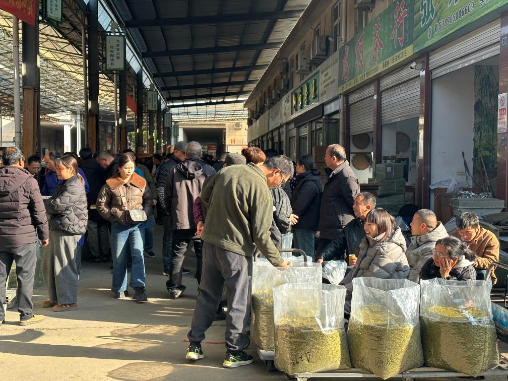 松阳浙南茶叶市场内,茶商正在选购新上市的绿茶。新华社记者吴帅帅 摄