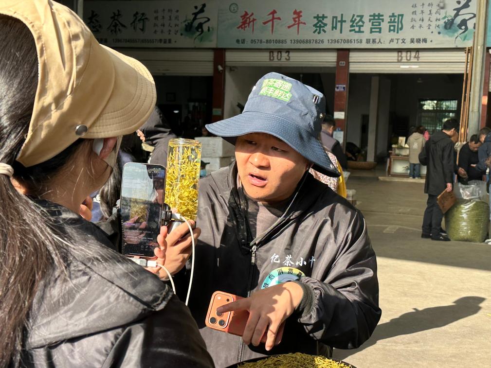 松阳浙南茶叶市场内,一名经销人员正在通过直播电商销售茶叶。新华社记者吴帅帅 摄