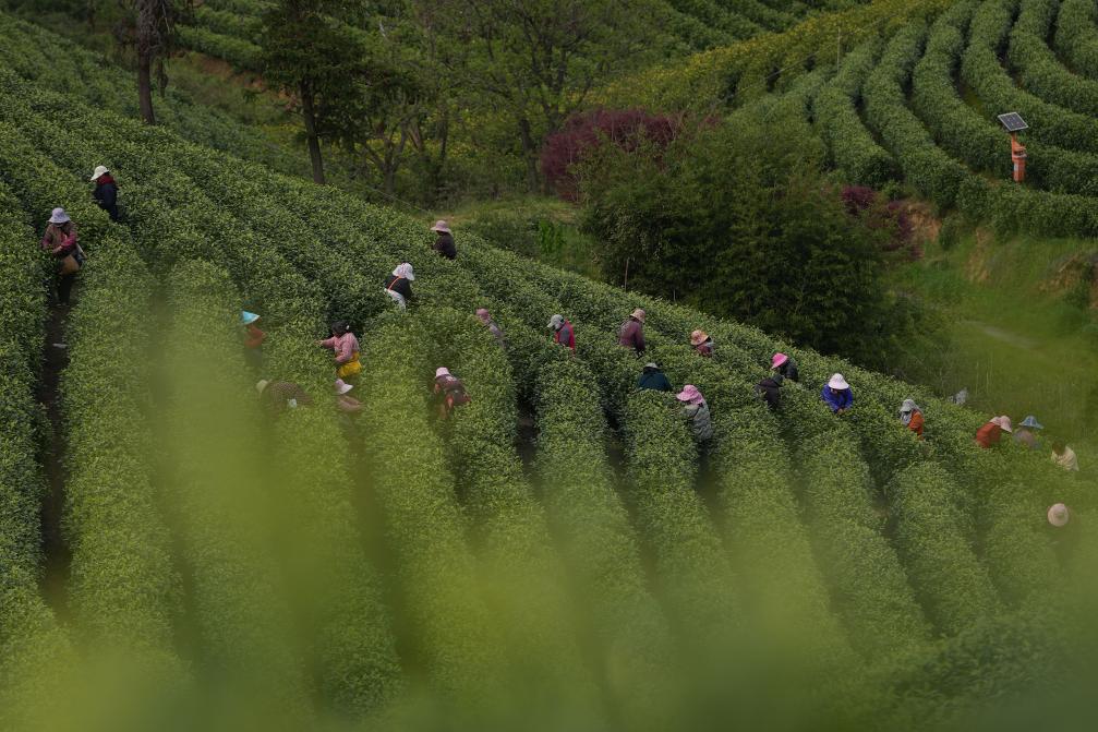 4月8日,采茶工在浙江省安吉县溪龙乡黄杜村的茶山上采摘白茶。新华社记者黄宗治 摄