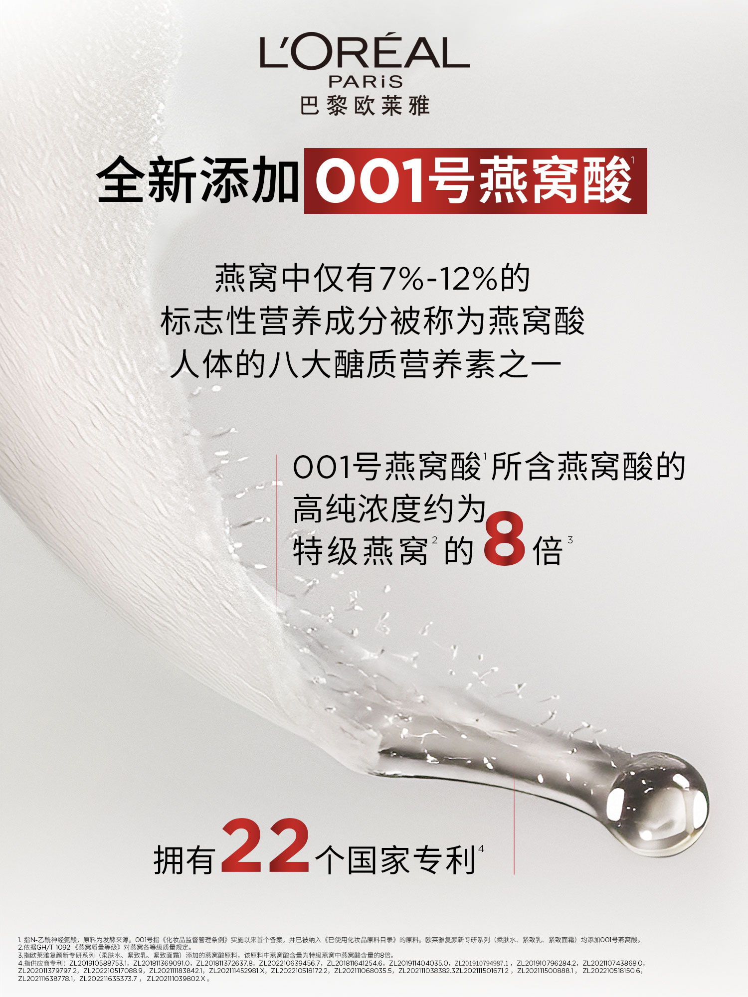 在全新“内补-中塑-外养”抗老思路的指引下,欧莱雅复颜迎来全新升级。这一经过中国市场三十年验证的经典口碑之作,不仅延续了视黄醇PRO、提拉紧致肽等经典“黄金成分”组合,同时还引入业界瞩目的明星成分“001号燕窝酸”协同加持,让抗皱紧致更加高效。自唐代以来,燕窝就作为养颜珍品被记载在各大医书典籍上。“001号燕窝酸”的加入,回应了熟龄肌的肌肤内补需求,让营养深入肌底,补足胶原支撑力;提拉紧致肽促进弹性纤维新生,抵御松弛下垂,重塑肌肤轮廓;视黄醇PRO促进表皮焕新,细养肤质与纹理,由内而外帮助肌肤找回饱满、紧致与细腻,外养肌肤好气色。三大成分协同,精准应对熟龄肌“皱、松、暗、干敏”问题。同时复配经典舒润矩阵,全线无添加酒精,兼顾减缓肌肤干敏不适需求,实现多维度的肌肤状态改善,给熟龄肌抗老一套安心的答案。