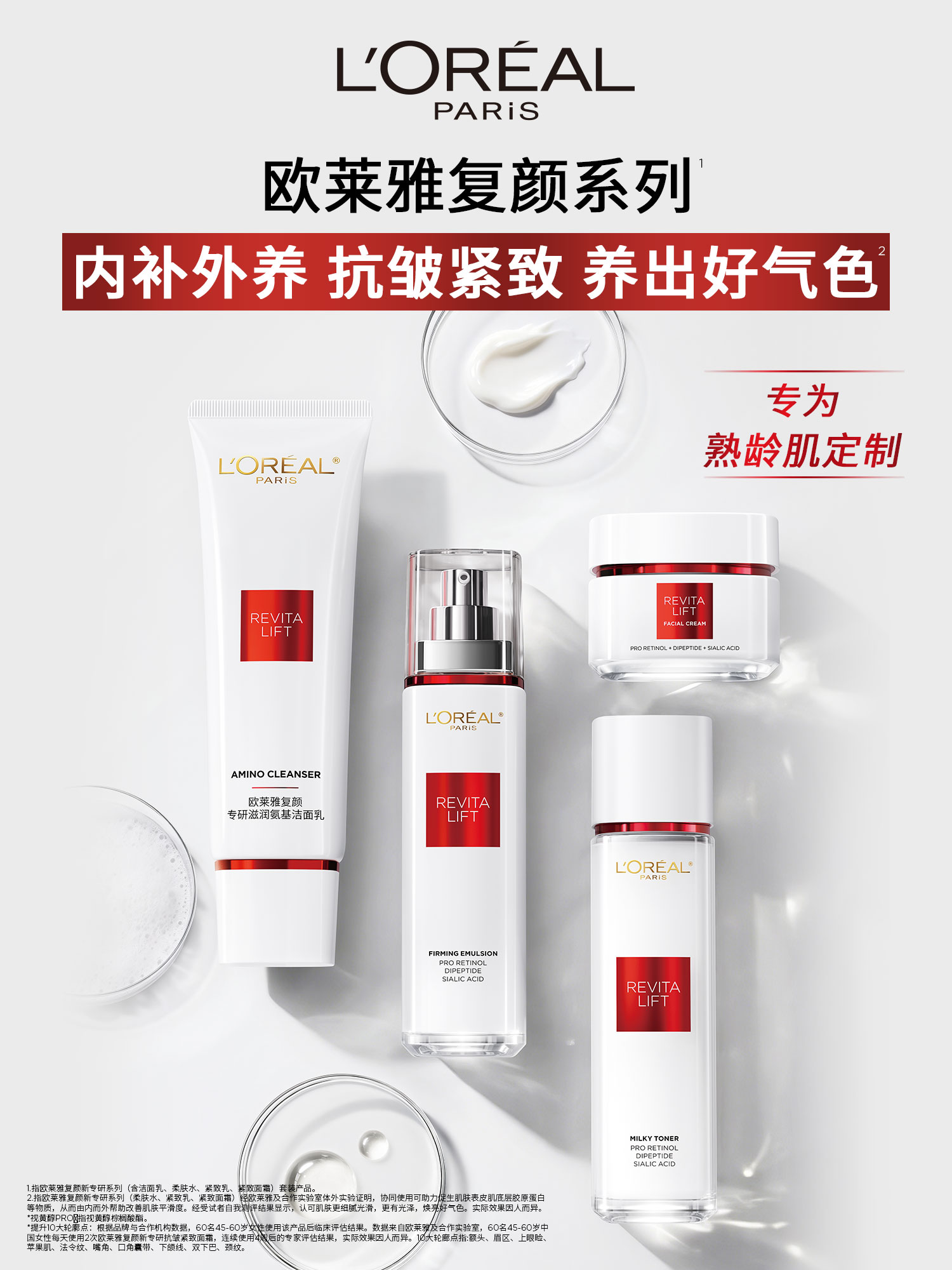 为了让消费者更深入地体验科学抗老理念,欧莱雅复颜系列提供从洁面到水乳面霜的完整成套护理方案。从氨基洁面温和净化肌肤开始,到柔肤水保湿锁水、乳液沁润充盈肌肤、面霜显著锁护肌肤营养,共同实现抗皱紧致的效果。
