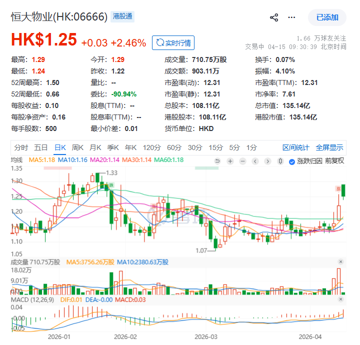 乐居财经 李兰 4月15日,截至9:30,恒大物业(06666.HK)股价涨2.46%,报1.25港元/股,总市值为135亿港元,较巅峰时期蒸发超93%。