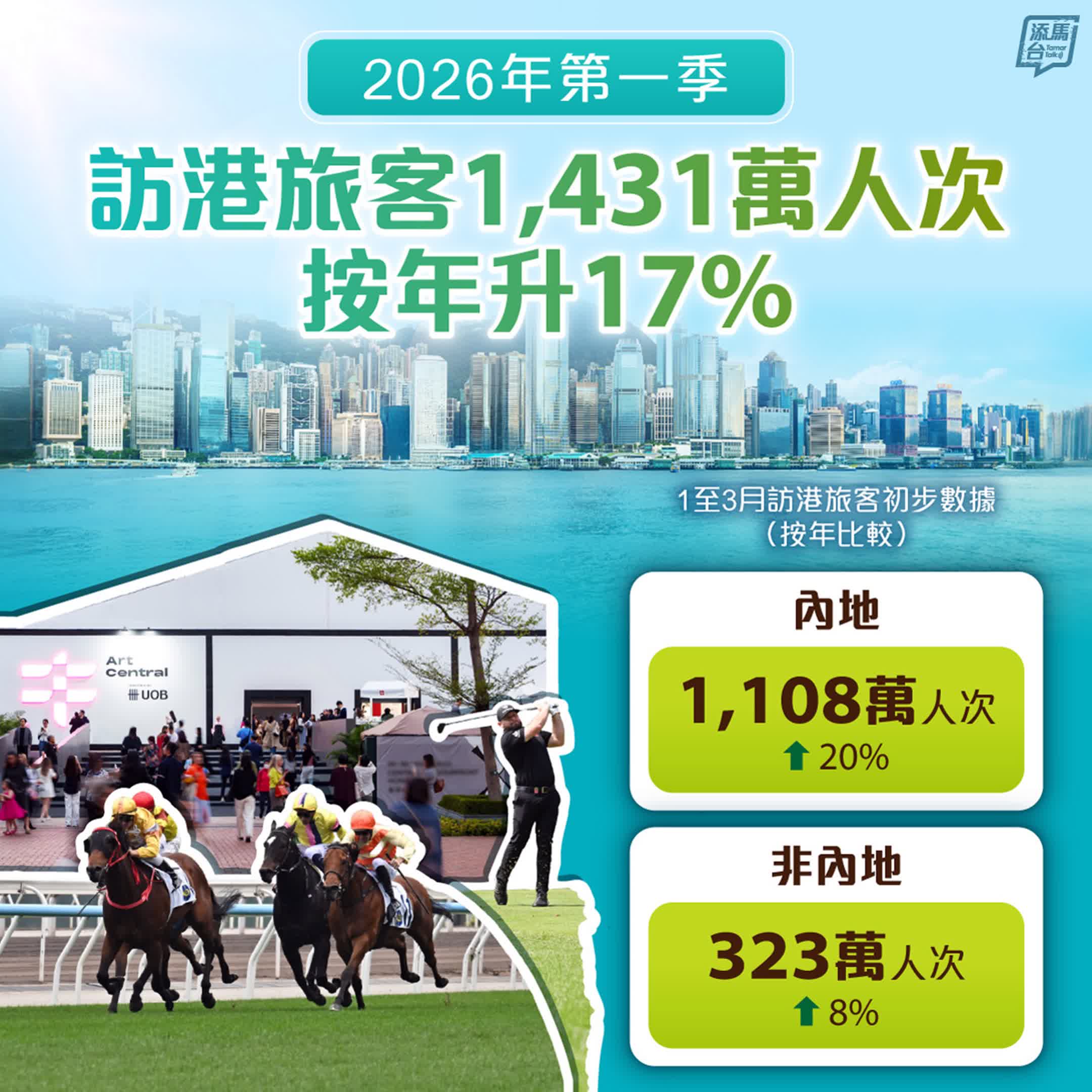 旅發局指出,今年單計3月訪港旅客人次為435萬,按年上升14%,當中非中國內地旅客佔27%。國際旅客佔比較之前高,相信受多項國際級藝文盛事帶動,例如巴塞爾藝術展香港展會、藝術中環展會、ComplexCon Hong Kong等。