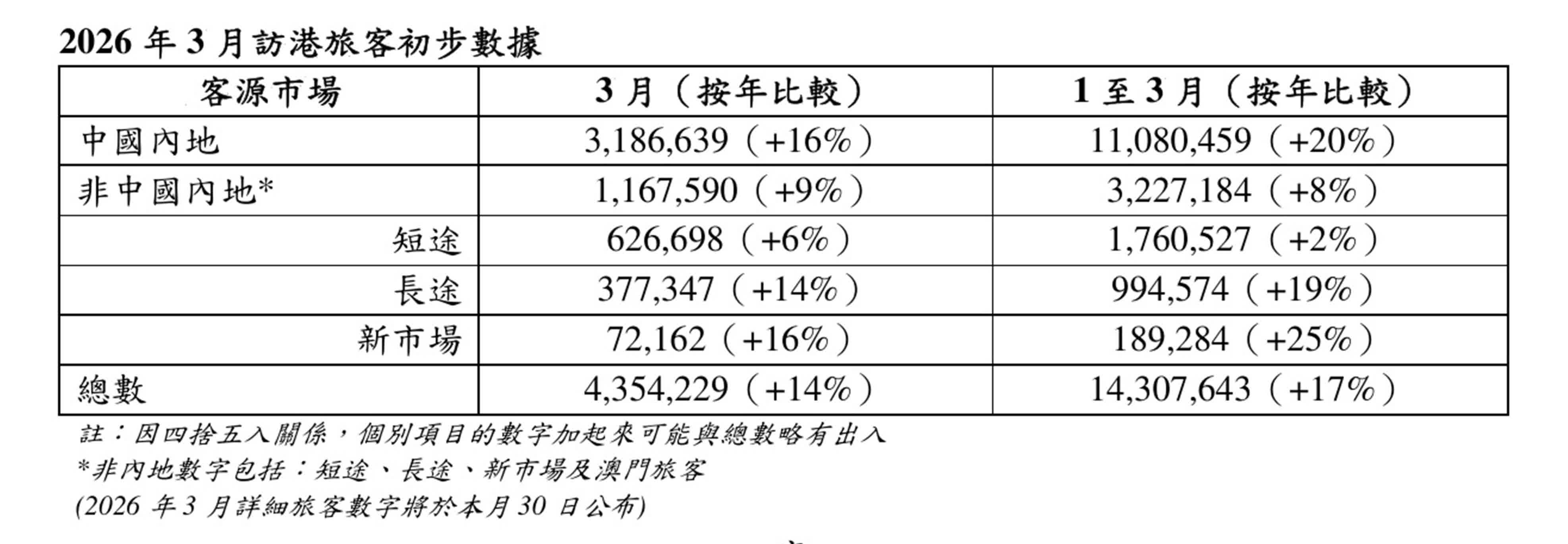 香港文匯報訊(記者 蕭景源)根據香港旅遊發展局(旅發局)今日(15日)公布的數字,2026年首季訪港旅客錄得1,431萬人次,按年增長17%。當中內地旅客佔1,108萬人次,按年增加20%;非內地旅客佔323萬人次,按年增加8%。內地旅客大幅增加主要受惠於本港有連串大型盛事上演,連同針對內地新春長假節慶宣傳推廣的疊加效應。