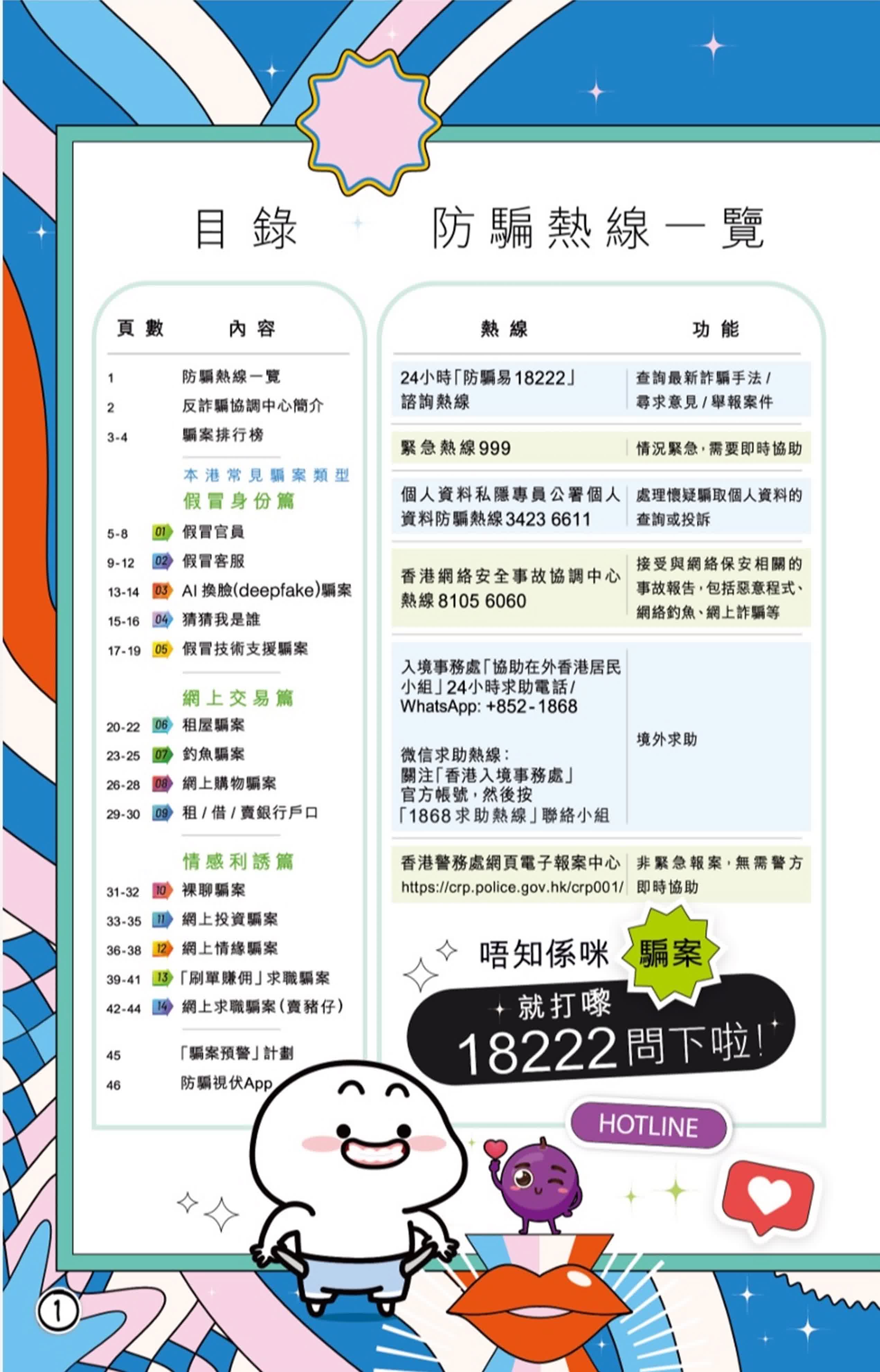 《全城防伏手冊》將時下最流行的14種詐術和騙局類型,分作假冒身份篇、網上交易篇、情感利誘篇,為讀者拆解騙術。正所謂學無止境,防騙亦一樣。若懷疑受騙,請立即參考手冊內提供的防騙熱線一覽,或致電「防騙易18222」熱線。