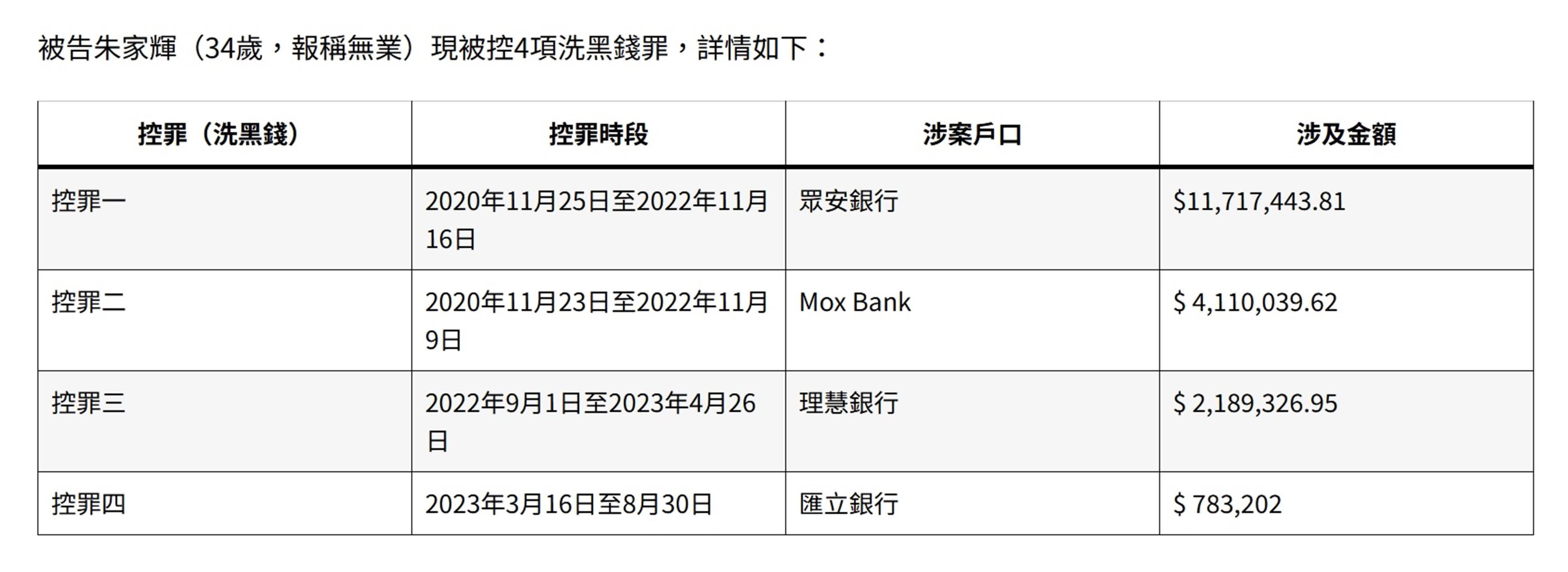 34歲的被告朱家輝,報稱無業。他被控4項處理已知道或相信為代表從可公訴罪行的得益的財產罪,指他於2020年11月至2023年8月期間,知道或有合理理由相信眾安銀行、Mox Bank、理慧銀行及匯立銀行的4個戶口內共約1880萬元為可公訴罪行得益,而仍處理上述財產。