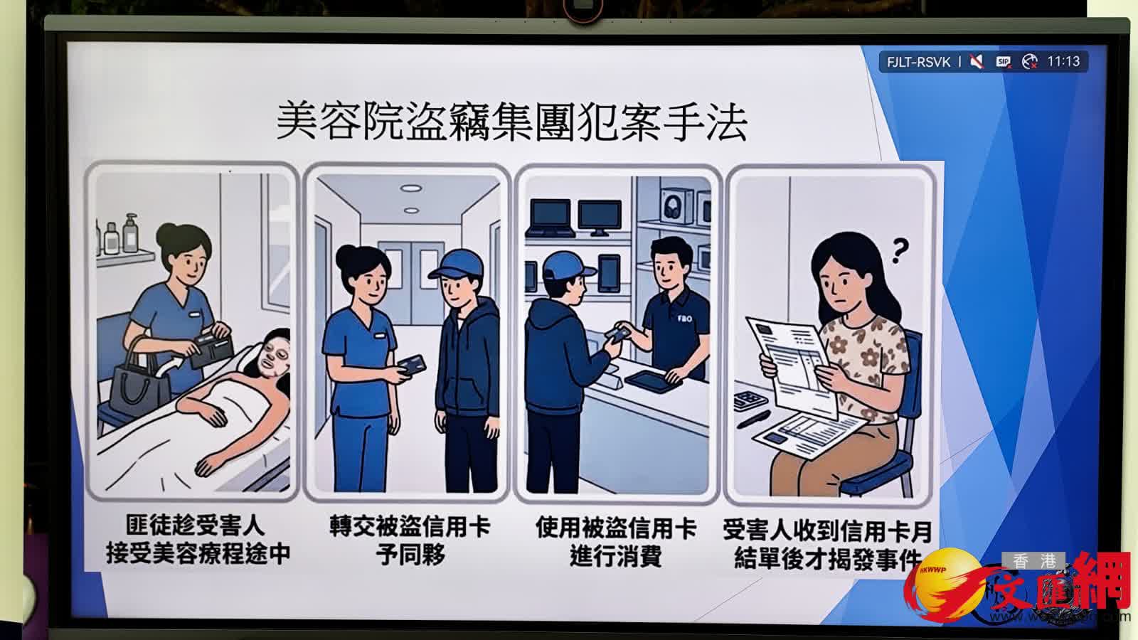 新界南總區刑事部李木易警司今日(16日)表示,該名美容師會在受害人接受美容療程前,要求將個人物品及手袋放在床邊或儀器旁邊。當受害人躺平接受療程、閉眼並且精神放鬆之際,趁機偷走受害人的信用卡。由於疑犯每次都只是偷取受害人錢包內的信用卡然後將錢包放回原位,此舉是避免受害人很快發現自己的信用卡被盜取,而事實上有受害人在收到銀行月結單時才察覺信用卡被盜。