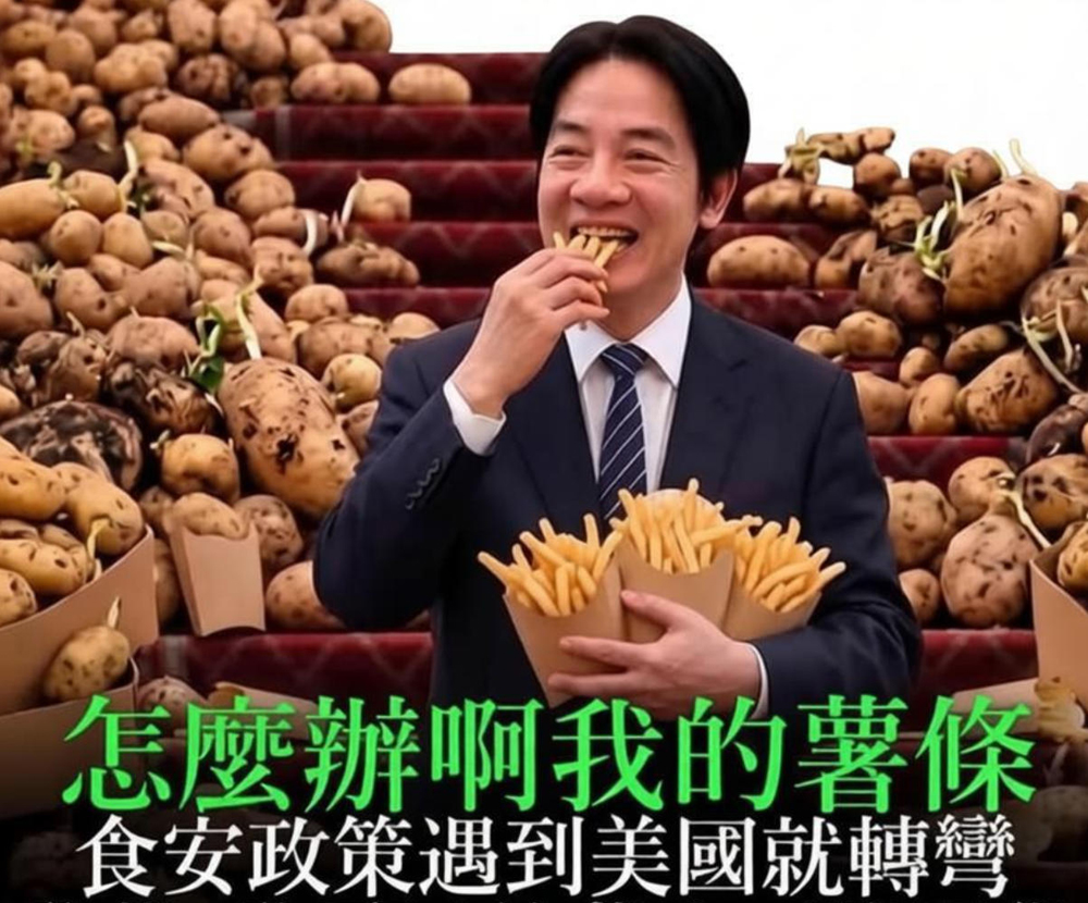 图注:台网友制作梗图,辛辣讽刺赖当局。中国台湾网4月23日讯 美国“毒土豆”输台议题近日引爆岛内。综合台媒报道,为讨好美方,赖清德当局将以往“只要发现发芽就整批退运”的检验方式,放宽为以后“只要将发芽单颗剔除,同批其他就可放行”。台行政机构还宣称“单颗剔除”是所谓“跟国际作法类似”。对此,台湾著名时事评论员、前民代郭正亮点名赖清德与台行政机构副手郑丽君二人最可恶,对美国要求台湾地区拿掉 SSG(特别防卫措施)竟然就答应了。未来不只土豆,包括含莱克多巴胺(瘦肉精)的美国猪脑、美国牛脑,恐怕都会进入台湾。郭正亮怒斥赖当局至今还在玩文字游戏。他质问,从整箱退货变成单颗筛除,这不是开放,那什么叫开放?“一个货柜这样倒在地上,几千几万颗,你叫进口商一个一个挑掉,这有可能吗?你用你的‘青鸟脑’想一想嘛!边境检验量能跟得上吗?每一颗都挑出来,挑漏了谁负责?”郭正亮怒指,赖当局的官员都说是“比照日本”,但日本跟台湾地区就是最怕特朗普。“‘舔美’舔成这样,结果本来还传出郑丽君要选台北市长。她这么可恶,面对美国要求要拿SSG,她竟然就答应了!”据郭正亮推估,郑丽君一定就此问过赖清德,“赖清德就答应了”。郭表示,以后台湾方面恐再也无法用安全规范的标准,对某些进口食物进行管制,“含有莱克多巴胺的猪脑以及牛脑,恐怕台湾都会碰到。”另外,美国的转基因食品等争议进口食物,未来也恐将在美方的一再抱怨下,被赖当局放行,甚至进入台湾校园。为此,郭正亮喊话要中国国民党加油,因为面对这样的无限制开放,各县市就需要建立自我保卫机制,不能让赖当局得逞。“到时候这些(问题食品)要进入台北市,台北市要抗拒,要去做溯源调查。”他表示,作为一名台北市民,只能期待市长蒋万安拿出办法,把这些东西挡在外面。因为这个“执政”当局不负责任,每天就想要“舔美”。针对赖当局开放美国“毒土豆”输台,国民党质疑此举严重危害台湾全体民众健康。多位蓝营民代21日在岛内立法机构轮番炮轰台行政机构负责人卓荣泰,质问其“发芽马铃薯的毒性难道会因为进了加工厂,变了薯片就自动衰退吗?”岛内舆论质疑,赖当局口口声声说要“保护本土农业”,结果却因政治考量放宽进口标准,完全不与社会沟通。这不仅是霸凌农民,更是毒害人民。(编辑/王思羽) [责任编辑:王思羽]