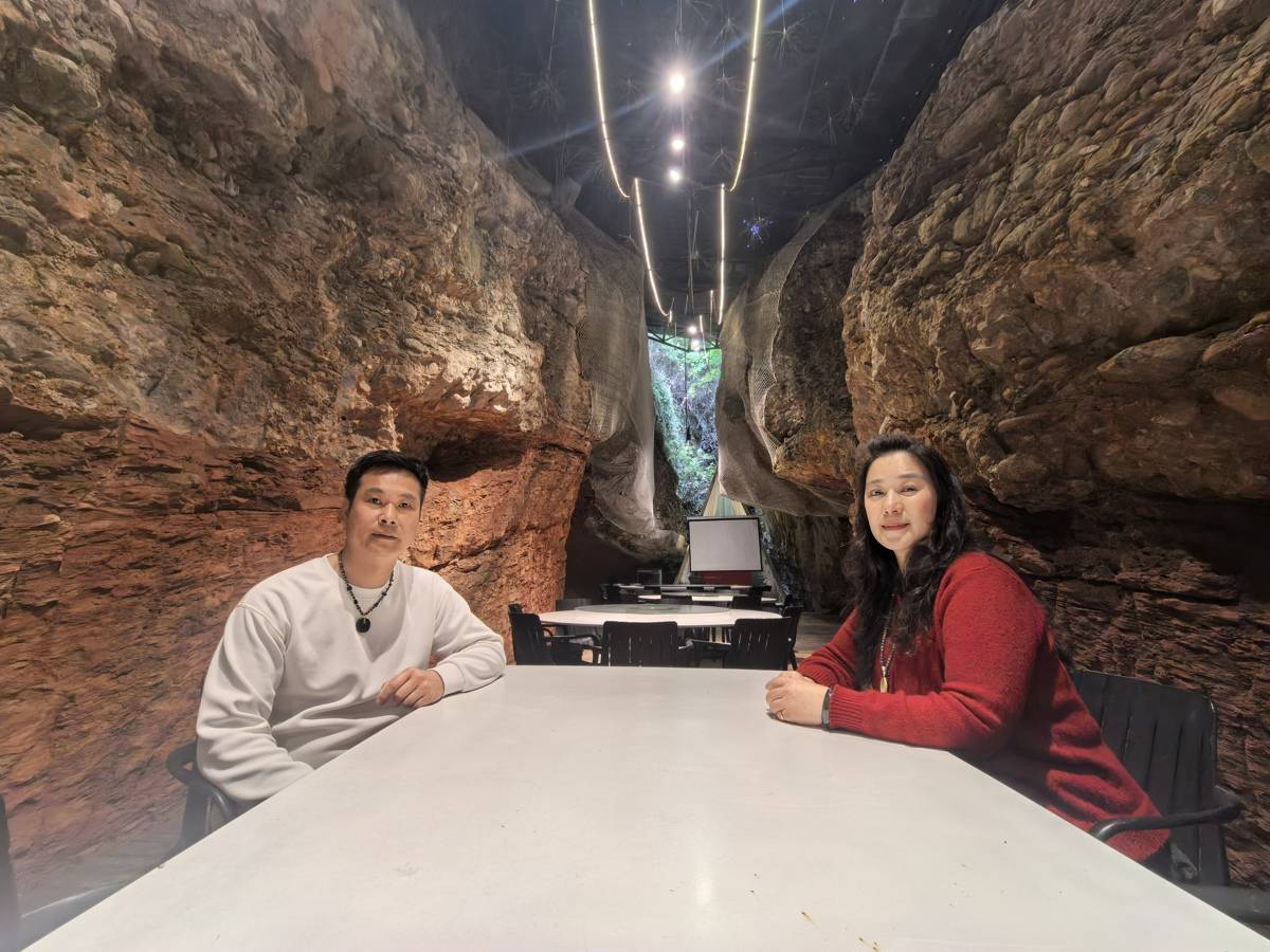 余国安(左)、韩军(右)在云景渔村岩洞餐厅内。