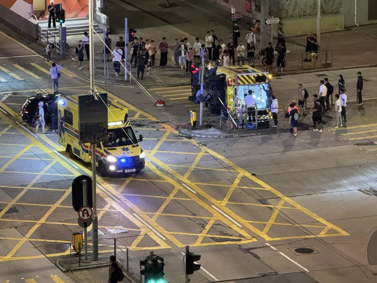 據現場初步消息指,救護車上2名救護員受輕傷,由網上圖片可見,多名街坊上前打開救護車後門協助救護員脫圍;據報私家車上3人亦受輕傷,大批救護及消防同袍事後趕至現場救援。警方正調查車禍起因。