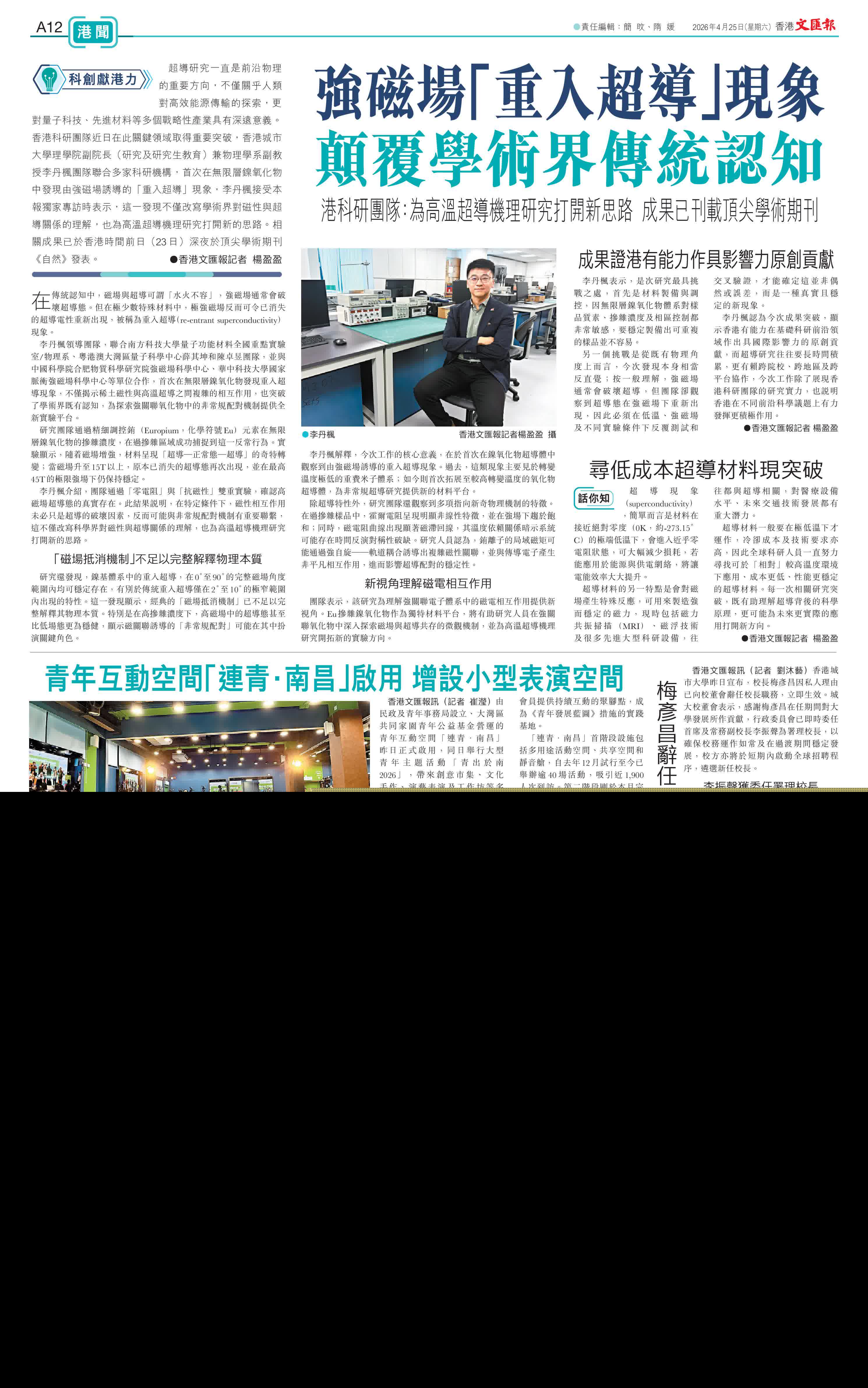 香港文匯報訊(記者 楊盈盈)超導研究一直是前沿物理的重要方向,不僅關乎人類對高效能源傳輸的探索,更對量子科技、先進材料等多個戰略性產業具有深遠意義。香港科研團隊近日在此關鍵領域取得重要突破,香港城市大學理學院副院長(研究及研究生教育)兼物理學系副教授李丹楓團隊聯合多家科研機構,首次在無限層鎳氧化物中發現由強磁場誘導的「重入超導」現象,李丹楓接受本報獨家專訪時表示,這一發現不僅改寫學術界對磁性與超導關係的理解,也為高溫超導機理研究打開新的思路。相關成果已於香港時間前日(23日)深夜於頂尖學術期刊《自然》發表。