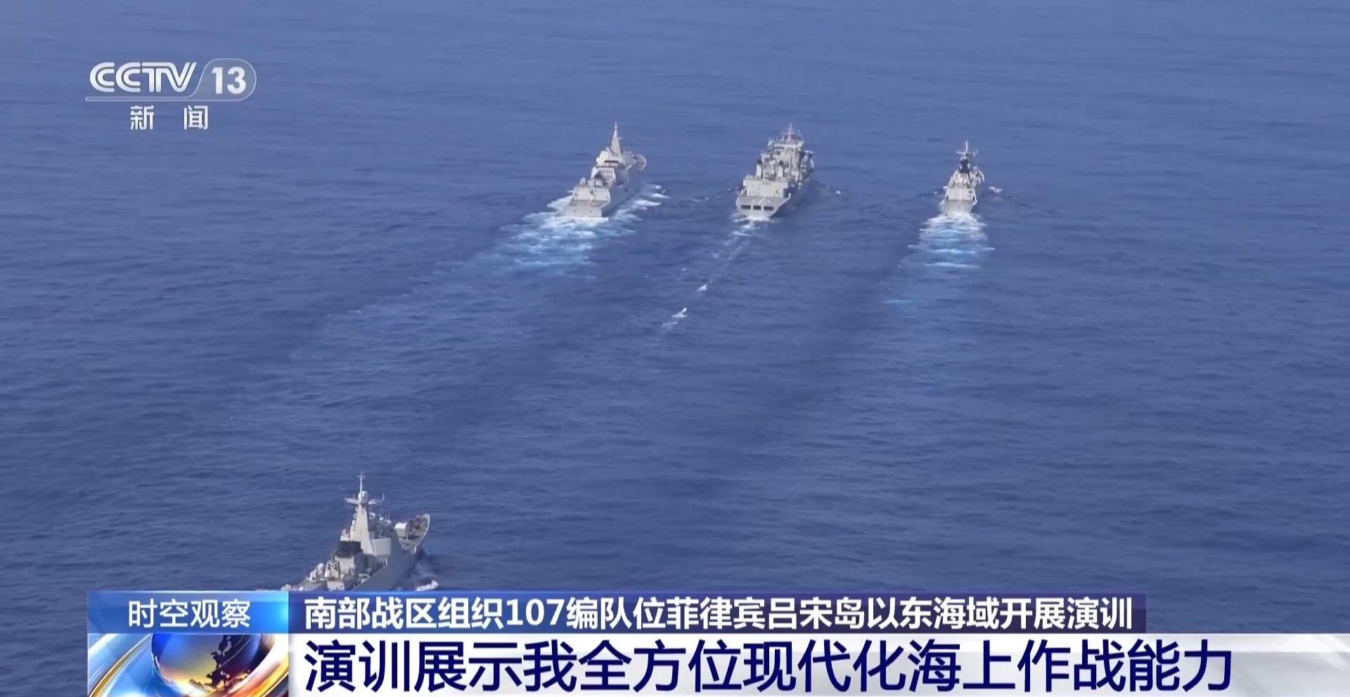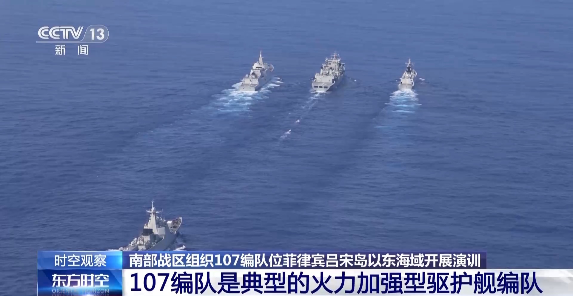 总台军事观察员 魏东旭:演训画面显示,107编队包括一艘055型驱逐舰、一艘052D型驱逐舰、一艘054A型护卫舰和一艘综合补给舰。这是一种典型的火力加强型的驱护舰编队。在编队当中,055型驱逐舰和052D型驱逐舰能够利用自身先进的相控阵雷达和远程的防空作战体系,为编队撑起严密的防空反导保护伞。