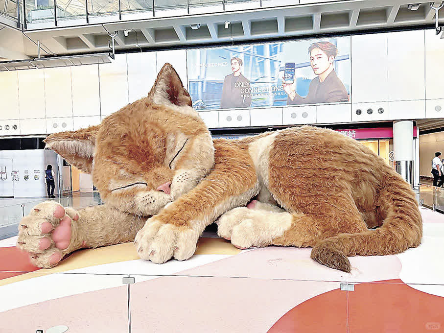 由即日起至5月2日,香港國際機場接機大堂A區展出巨型貓咪裝置「旅途上的『喵』」迎接旅客,為旅途帶來溫馨與療癒。橘色的巨型貓咪正以蜷縮的姿態安靜熟睡,絨毛質感細密柔軟,肉球色澤粉嫩,細節超還原。貓咪的耳朵與尾巴還會不時輕微擺動,栩栩如生。旅客除了能夠在展品前打卡,還能透過特設裝置與貓咪互動,包括餵食、撫摸、用逗貓棒與貓咪玩耍等虛擬體驗,從未養過貓的旅客也能通過這個裝置過一把「雲養貓」的樂趣。