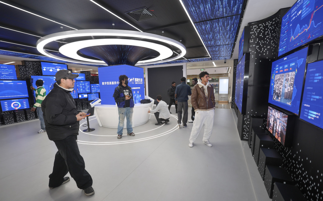 中外客商在义乌全球数贸中心观看数字大屏 图源:新华社