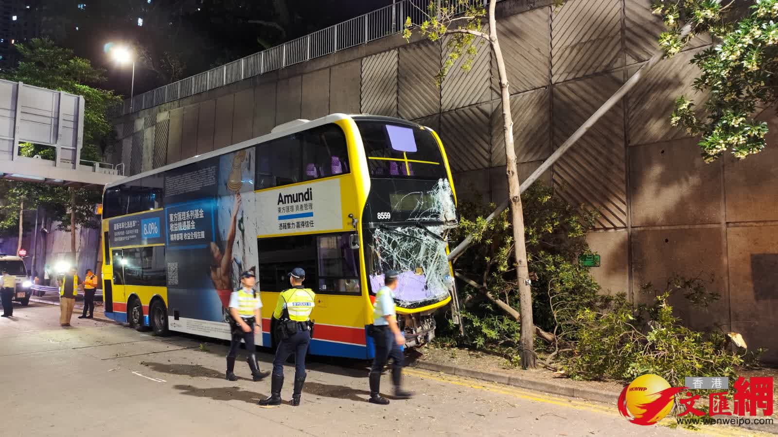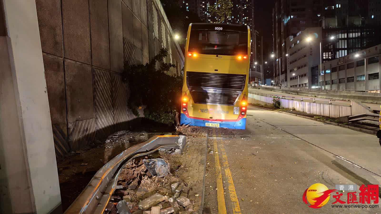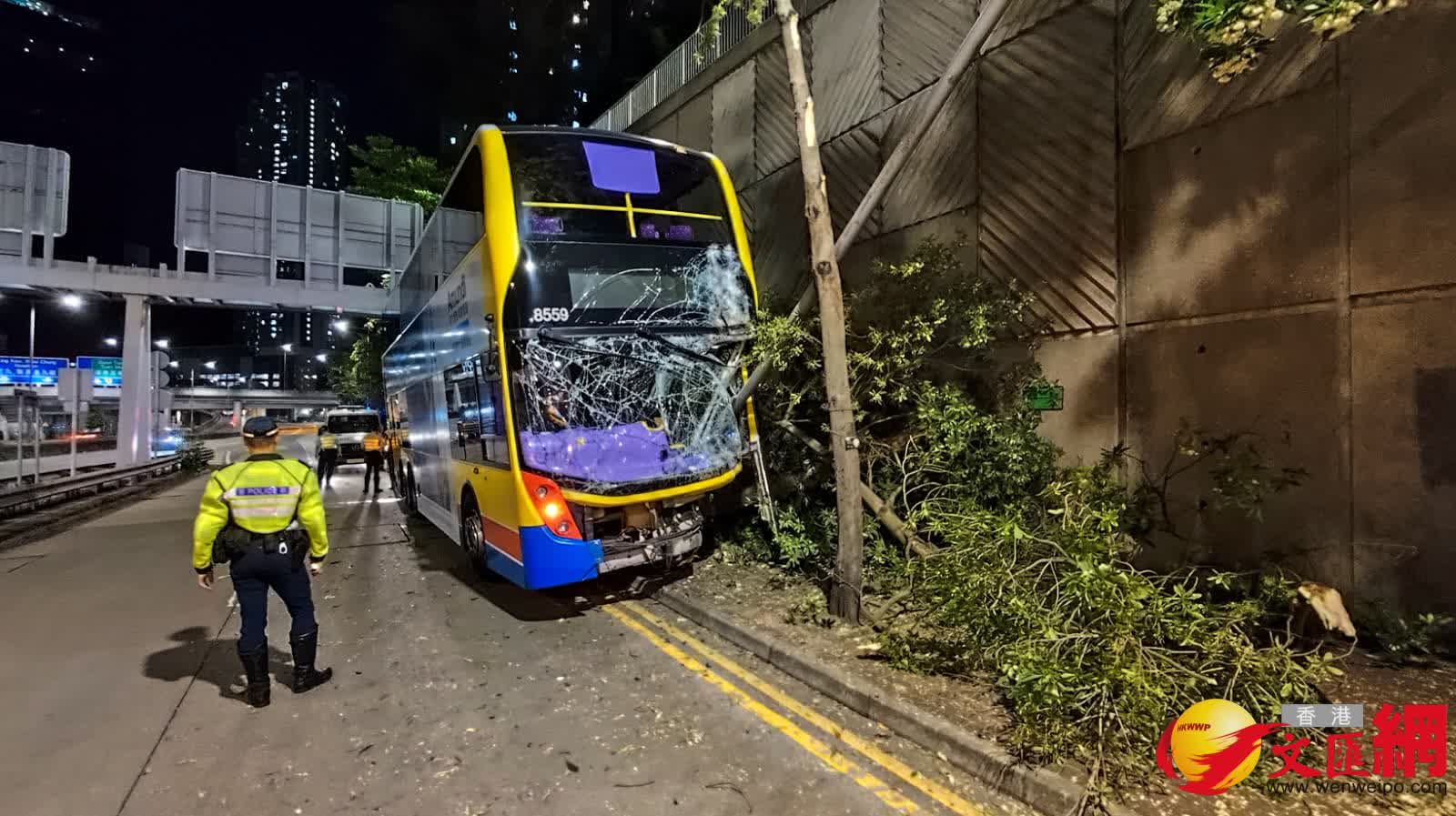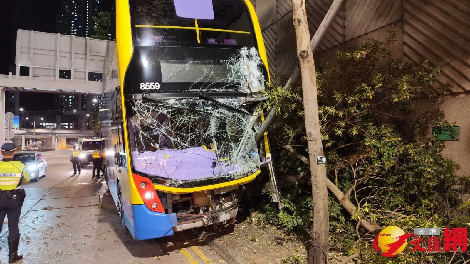 香港文匯報訊(記者 蕭景源)今日(27日)晚上約10時,一輛無載客的城巴沿青山公路荃灣段駛至近象鼻山路交界,突然失控向左撞向路邊防撞圍欄,再剷上行人路撞向一支燈柱和大樹始停下,途人見狀立即報警。救援人員到場,證實無人受傷。現場所見,失事巴士的左邊車頭嚴重損毀凹陷,擋風玻璃爆裂,被撞燈柱傾側,另有大樹被撞倒。