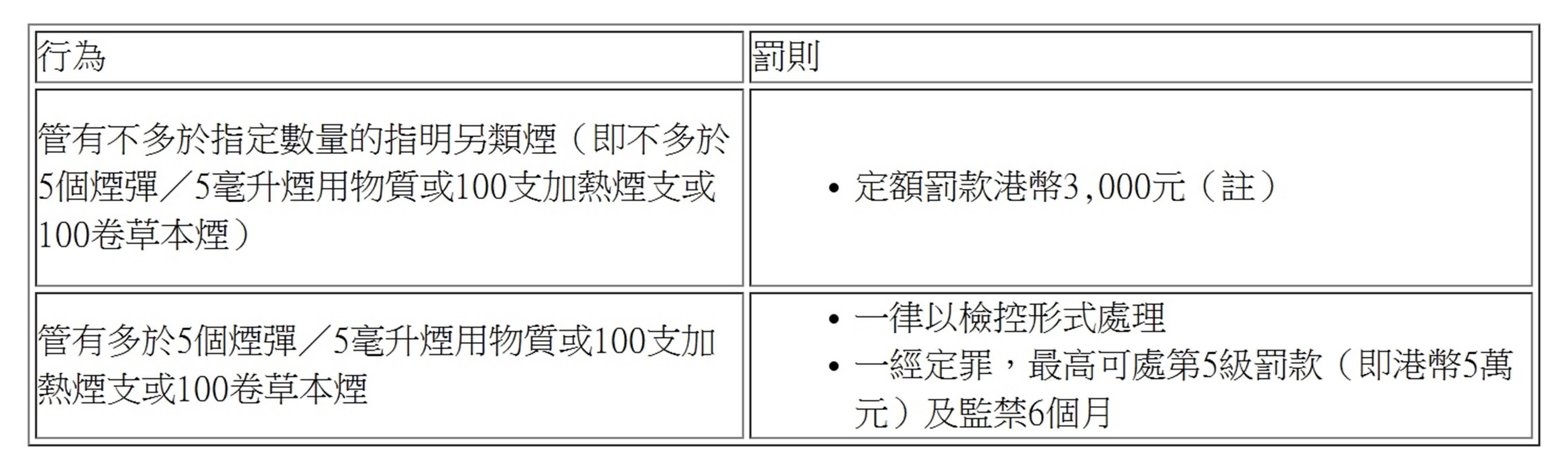 控煙酒辦指,政府4年前(即2022年4月30日起)已全面禁止入口、製造、宣傳、售賣和為商業目的而管有另類煙,減低另類煙成為煙草商引誘市民特別是年輕一代上癮成為煙民的機會。換言之,4年來社會上既無合法途徑獲得另類煙,亦不能從境外攜帶來港,在禁令生效前已購入作自用的另類煙產品亦應已於一定期限內大致消耗。明日(4月30日)起實施的管有禁令進一步完善對另類煙的整體規管,防止另類煙這類有害的煙草產品繼續在本地流通,並從根本打擊使用另類煙吸食毒品或有害物質的行為。