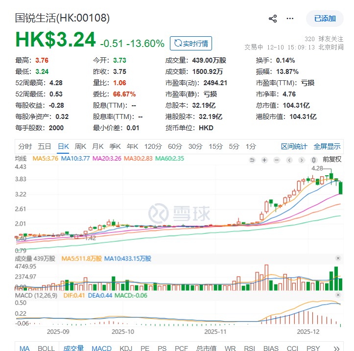 国锐生活股价跌超13%,拟2.7亿元控股春雨医生