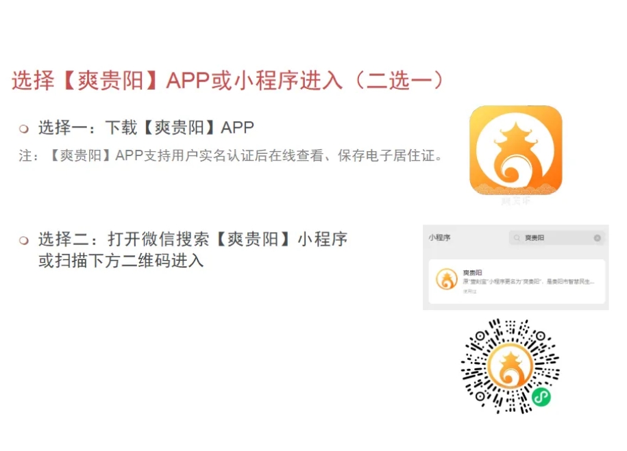 爽贵阳小程序或APP登录:在微信小程序中搜索“爽贵阳”,进入“爽贵阳”小程序或“爽贵阳”APP,在页面找到“义教入学”登记入口,或直接扫描下方二维码进入小程序。