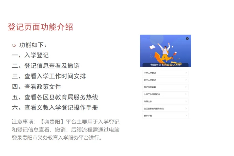 此外,贵安新区义务教育招生入学工作由贵安新区社会事业管理局负责实施;贵阳国家高新技术产业开发区义务教育招生入学工作按原有政策执行;贵州双龙航空港经济区义务教育招生入学工作由南明区教育局负责实施,双龙航空港经济区创新创业金融服务中心加强办学保障。填报期间,建议家长错峰登录,在系统开放的时段内,均可完成登记和验证。