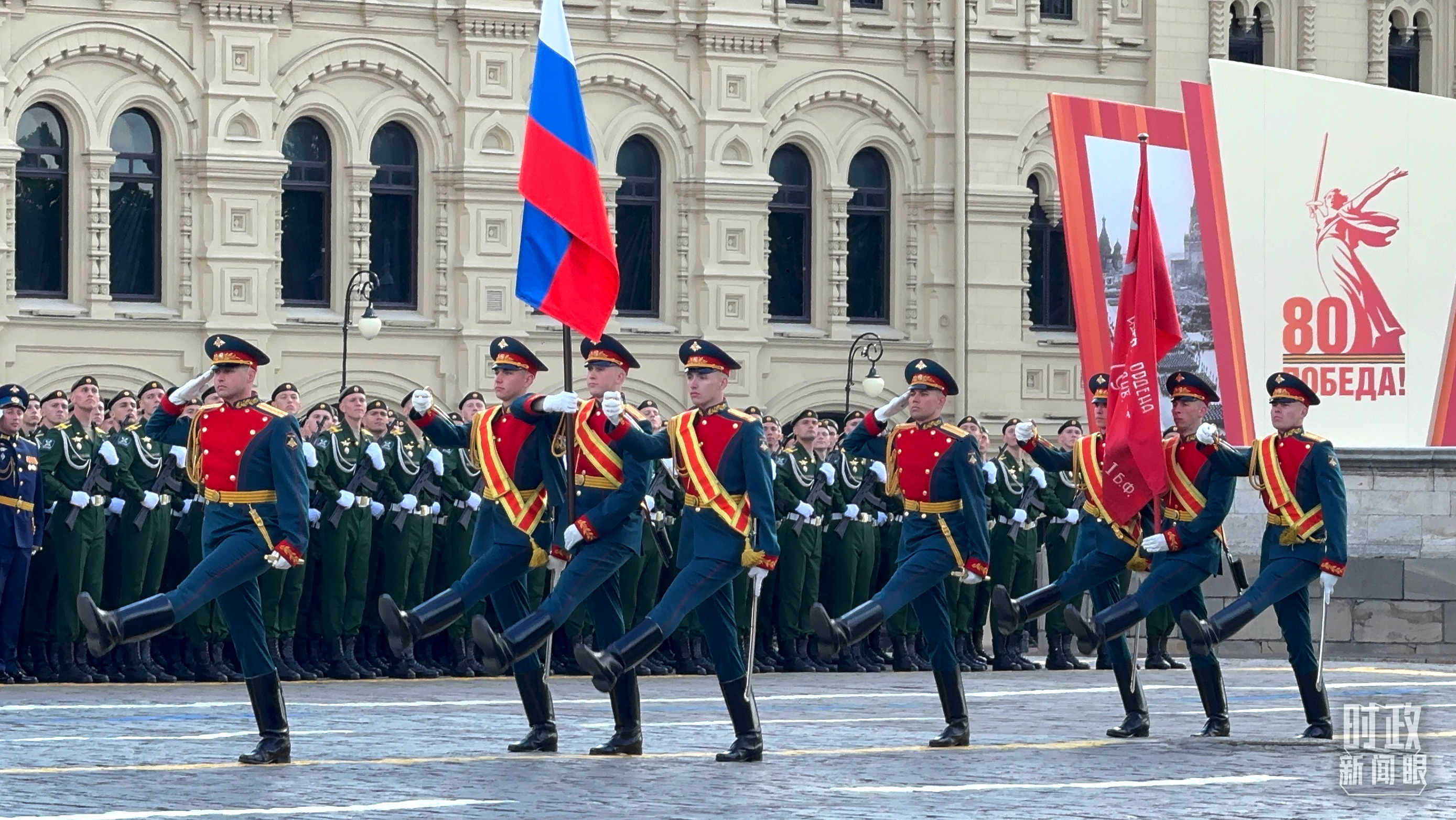 △中国人民解放军三军仪仗队方队军容严整、士气高昂,迈着坚定有力的步伐走过红场。(总台记者李晋拍摄)