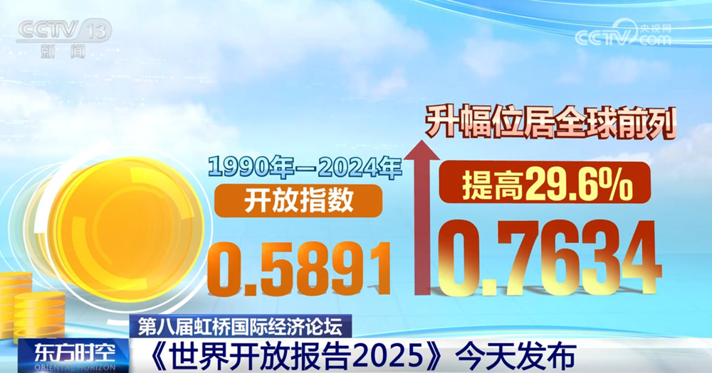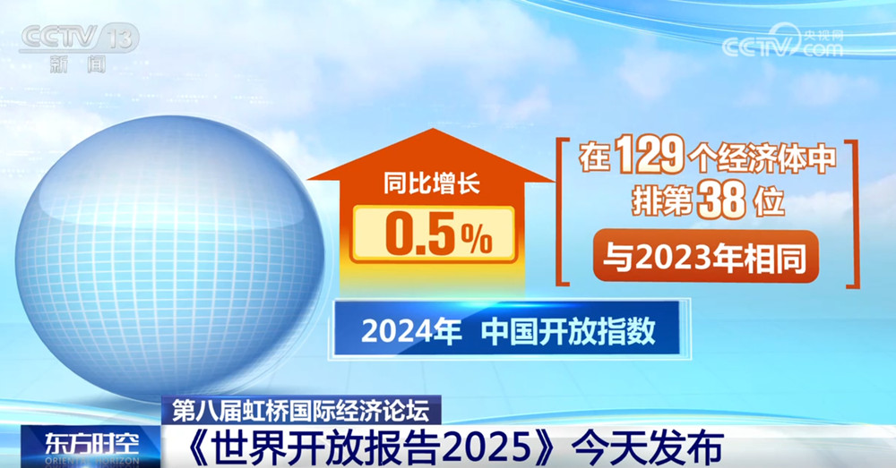 يبلغ مؤشر الانفتاح العالمي في عام 2024 0.7545، بانخفاض سنوي قدره 0.05%، بانخفاض قدره 0.34% مقارنة بعام 2019، وانخفاض بنسبة 5.39% مقارنة بعام 2019. 2008. في حين تم تشديد الانفتاح العالمي قليلا، حقق توسع الانفتاح في الصين نتائج ملحوظة. ومن عام 1990 إلى عام 2024، ارتفع مؤشر الانفتاح من 0.5891 إلى 0.7634، أي بزيادة قدرها 29.6%، ليحتل المرتبة الأولى في العالم. وفي عام 2024، سيرتفع مؤشر الانفتاح الصيني بنسبة 0.5% على أساس سنوي، ليحتل المرتبة 38 بين 129 اقتصادًا، وهو نفس الرقم في عام 2023.