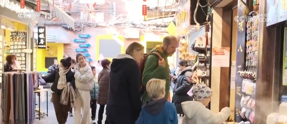 The big data platform also found that foreigners have also joined the army of ice and snow tourism. The number of foreign tourists visiting Harbin increased by 42% compared with the same period last year, and the number of tourists to the Southern Ski Resort also increased by 10% compared with the same period in 2024. In terms of passenger flow, the areas with the highest popularity of skiing are concentrated in Heilongjiang, Jilin, Hebei, Xinjiang and Beijing. Inbound travel - shopping for New Year's goods in the old streets. Foreign tourists experience the New Year's atmosphere.