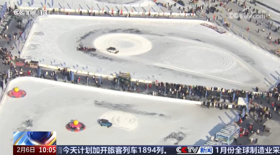 Along the Songhua River, we continue to go upstream. Now we see the frozen Songhua River surface is very lively. This is the Songhua River Ice and Snow Carnival Scenic Area. Look, cars pulling snow circles on the ice are drifting, and people are enjoying the fun brought by ice and snow.