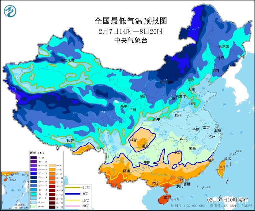 CCTV News: The Central Meteorological Observatory continues to issue a blue warning for cold wave at 10:00 on February 7. Affected by strong cold air, from 14:00 on February 7 to 20:00 on February 8, the southern part of the Huanghuai region, most areas in the southern part of Heilongjiang, northern Tibet, southern Qinghai and other places dropped by 6 to 8°C. Among them, the cooling of some areas in central and southern Anhui and northeastern Jiangxi can reach more than 10°C. On the morning of the 8th, the lowest temperature 0℃ line will press south to the southern part of Guizhou to southern Jiangnan.