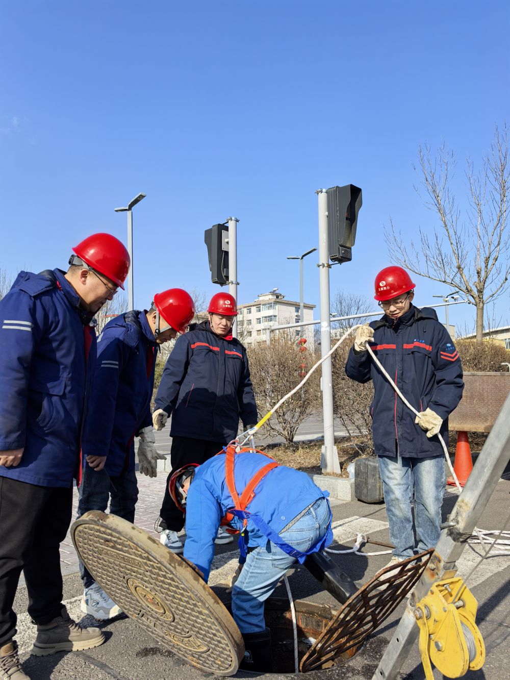 After the beginning of spring, it is still cold and the outdoor temperature drops sharply, and the heating pressure also increases. Line patrol heating workers need to "take pulse and consult" in an underground well 4 meters deep to check whether there are loopholes in the pipeline.
