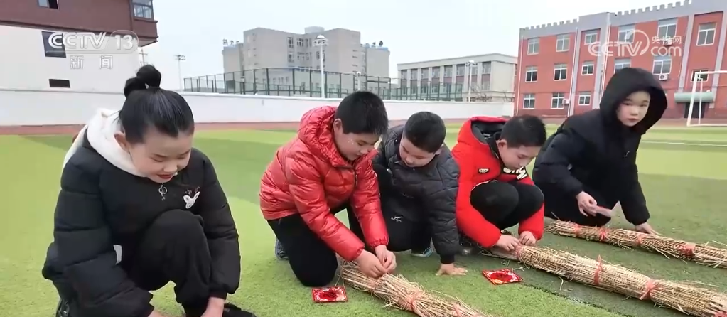 In Taizhou, Jiangsu, with the enthusiasm of the Lantern Festival just passed, the first lessons of many schools are related to folk customs and intangible cultural heritage. On the playground of this elementary school, the children are making local unique "makes". Everyone tied straw into a small bundle, wrapped it in red thread, pasted the word "Fu" and the makes are ready.