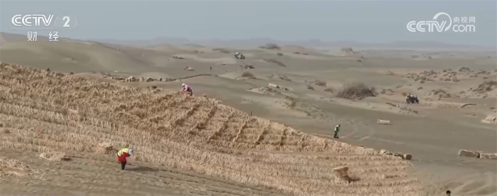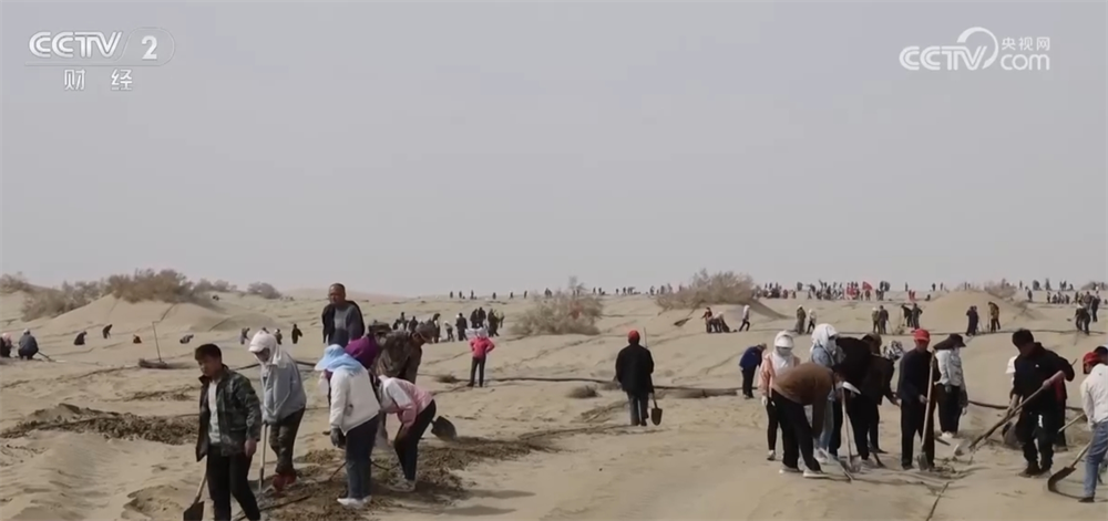 In Nantun Town, Tiemenguan City, Xinjiang, hundreds of local residents are surrounding the edge of the Taklamakan Desert. They spread clusters of reeds on the sand, then rolled them into the sand with shovels, leaving half of them standing naturally, forming square-shaped micro protective nets, and contiguous pieces play the role of preventing wind and sand.