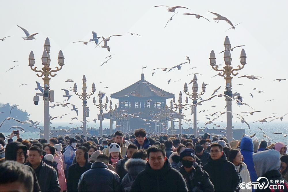 On January 13, seagulls gathered in Qingdao Tsingqiao Scenic Area, Shandong Province, citizens and tourists flocked to them, and people and gulls interacted intimately, presenting a unique winter scenery.
