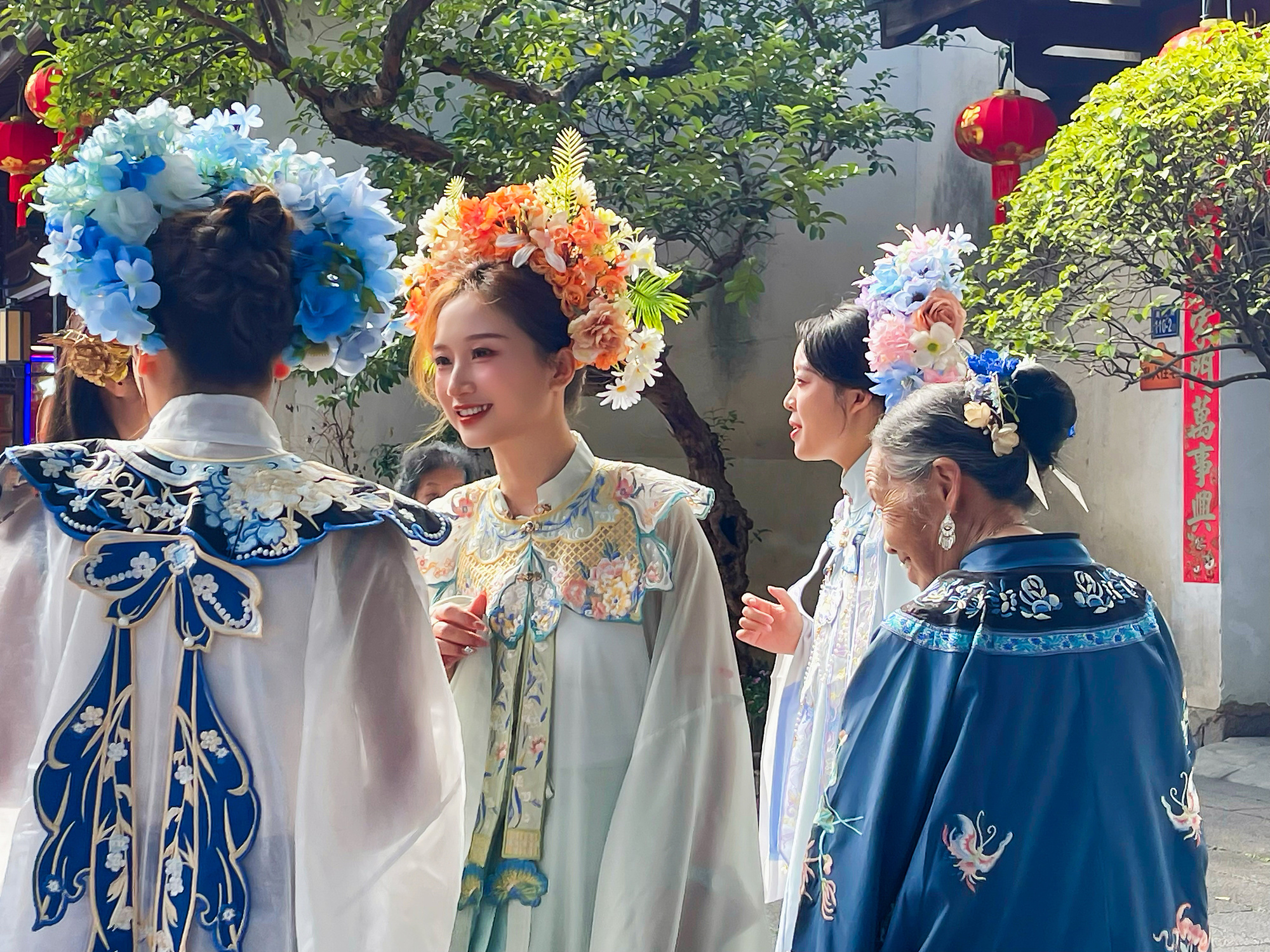 Tourists wear "three hairpins" on their heads and wander in the historical and cultural district of Shangxiahang, Fuzhou