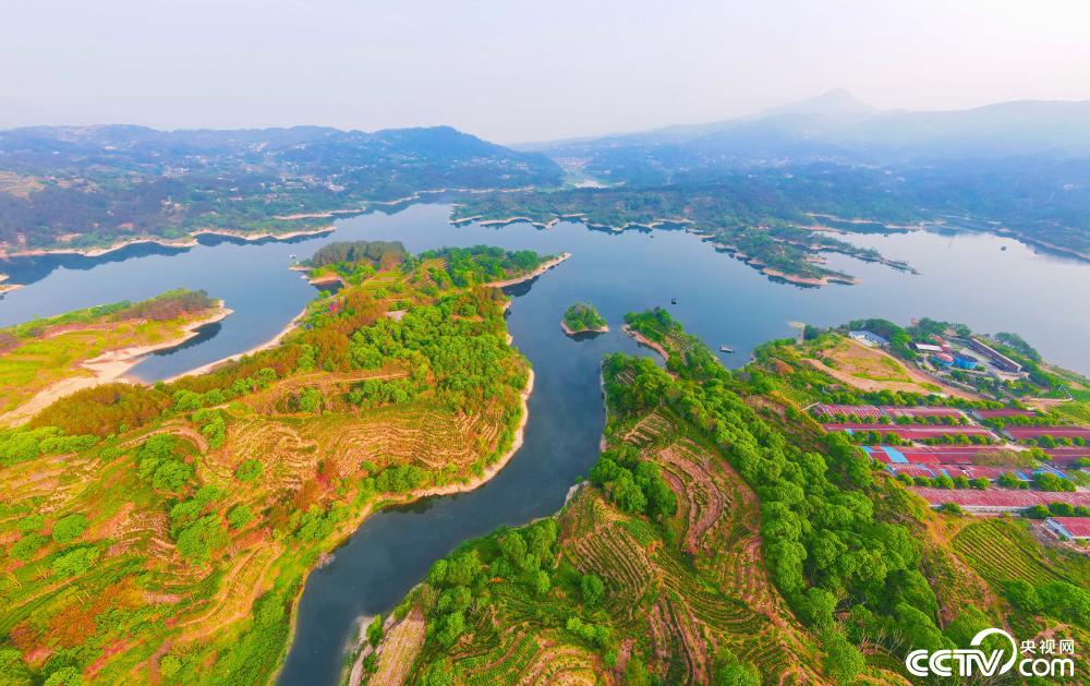 In the area of ​​Linhe Village, Maojianshan Township, Yuexi County, Anqing City, Anhui Province, the clear lake water is sparkling, and lush islands dotted on it, reflecting the houses and mountains, making the scenery beautiful.