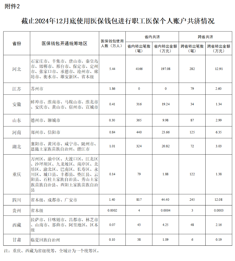 As of the end of December 2024, 41 coordinated areas in 11 provinces including Hebei, Anhui, Tibet have been officially piloted, with a total of 115,600 people using medical insurance wallets, 7,695 transfers, with a total amount of 3.6744 million yuan. From the perspective of Tongji area, there were 6,592 transfers within the province, with a transfer amount of 3.2241 million yuan; 1,103 transfers across provinces, with a transfer amount of 450,300 yuan. From the perspective of mutualism, the total amount of 1,015 medical insurance wallets is used to pay medical treatment and drug purchases is 139,500 yuan; the total amount of 141 resident medical insurance costs is paid using the wallets is 57,000 yuan.