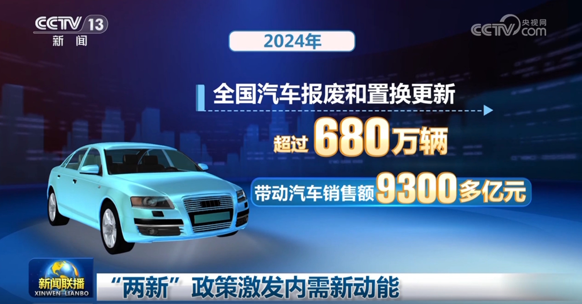 In 2024, the retail sales of electrical appliances and audio-visual equipment in my country increased by 12.3% year-on-year, breaking the trillion yuan mark for the first time; more than 6.8 million vehicles were scrapped and replaced and updated nationwide, driving car sales of more than 930 billion yuan, further stimulating consumption vitality.