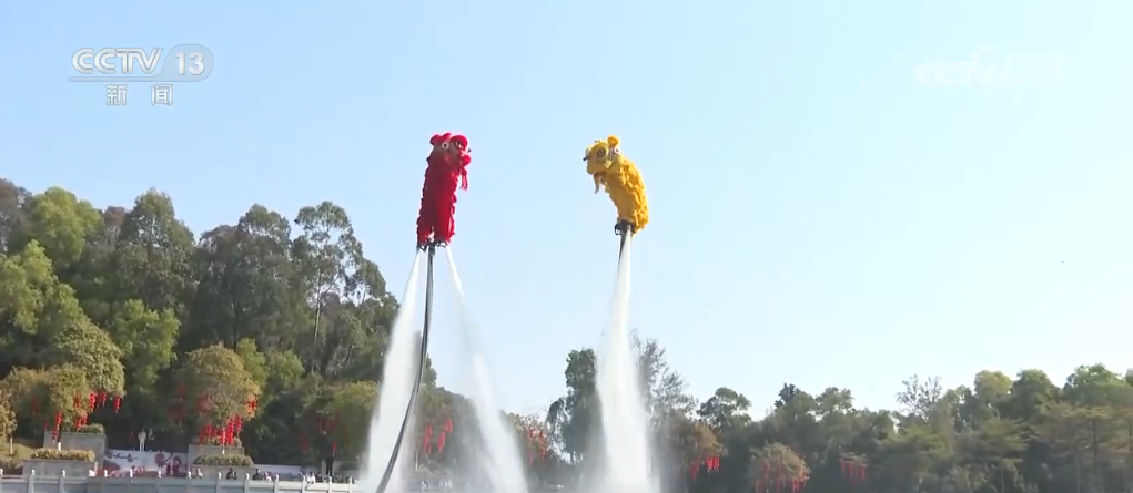 At the Guangzhou Lianhua Mountain Tourist Attraction, a pair of lion-drawing pedal aircraft took off in the air. This way of combining traditional Lingnan lion-drawing culture with modern technology refreshes tourists.