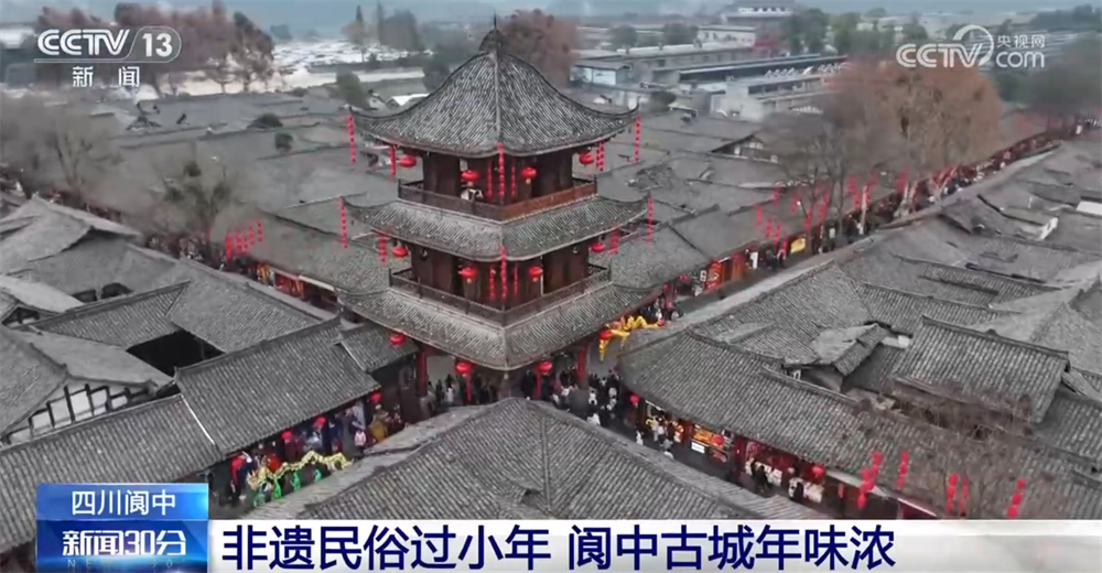 In Langzhong, Sichuan, intangible folk activities such as dragon and lion parades and bamboo horses and cow lanterns are traditional projects of the Little New Year. The reporter saw at the scene that the colorful dragon and lion dance performance was being performed in the middle of the ancient city. From the perspective of the sky, you can see two different colored dragons, moving from the east and west directions toward the center of the ancient city.