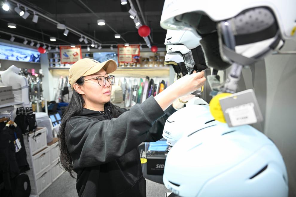 Zhang Nianci sorted out helmets and other products in the snow equipment store (photo on January 22). Photo by Xinhua News Agency reporter Hu Huhu