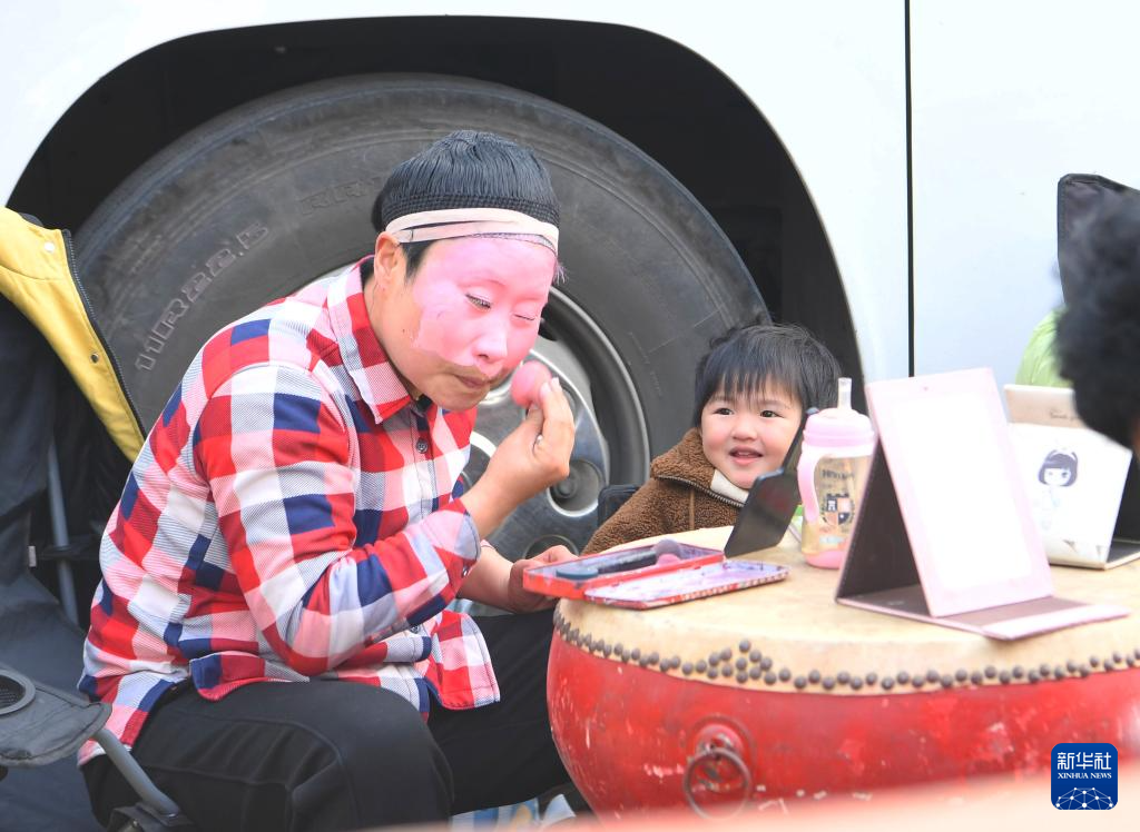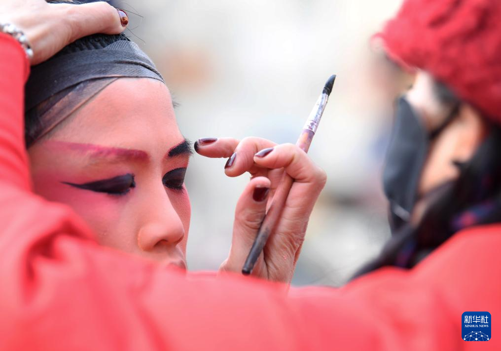 On January 21, in Dachi Village, Shilin Town, Dengzhou City, Henan Province, actors of Wanbang Opera Troupe put on makeup off the stage.
