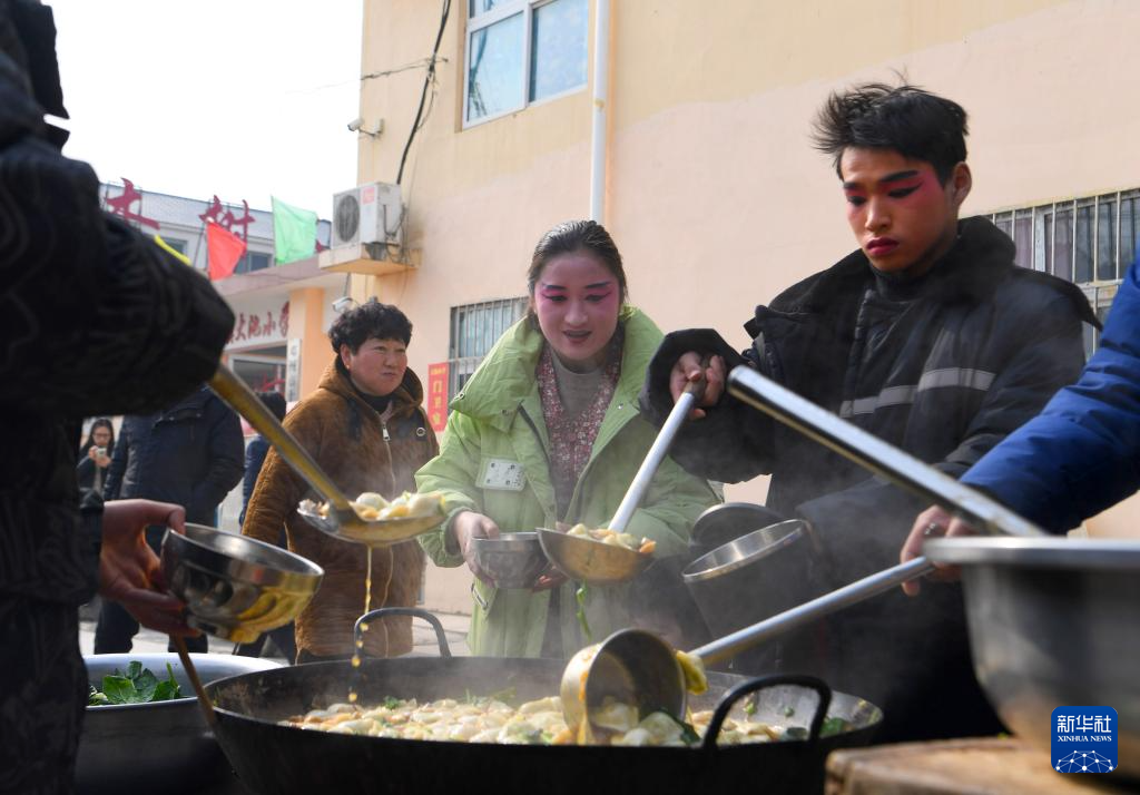 On January 21, in Dachi Village, Shilin Town, Dengzhou City, Henan Province, actors from Wanbang Opera Troupe were queuing for dinner.