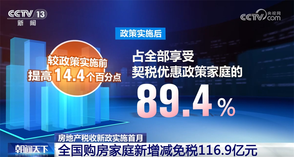 Data shows that in the first month of the implementation of the new real estate tax policy, home buyers nationwide added 11.69 billion yuan in tax exemptions. The new policy will increase the housing area standard for individuals who enjoy a 1% discount on housing deed tax from 90 square meters to 140 square meters, with an additional tax reduction of 6.5 billion yuan. After the implementation of the policy, 1.407 million households who individuals who purchase housing and enjoy the minimum preferential tax rate for 1% deed tax, accounting for 89.4% of all households who enjoy the preferential tax policy for deed tax, an increase of 14.4 percentage points from before the implementation of the policy.