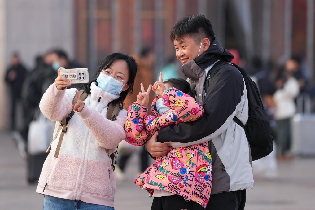 Am 24. Januar machte ein Kind (Mitte) ein Foto mit seiner Familie am Peking Station Square. Foto von Xinhua News Agency Reporter Ju Huanzong