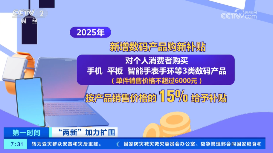 Pada tahun 2025, subsidi baru untuk membeli produk digital akan ditambahkan. Bagi masing -masing konsumen untuk membeli tiga jenis produk digital seperti ponsel, tablet, jam tangan pintar dan gelang (harga jual satu bagian tidak melebihi 6.000 yuan), subsidi akan diberikan pada 15% dari harga jual produk. Setiap konsumen dapat mensubsidi satu bagian untuk setiap jenis produk, dan setiap bagian tidak melebihi 500 yuan.