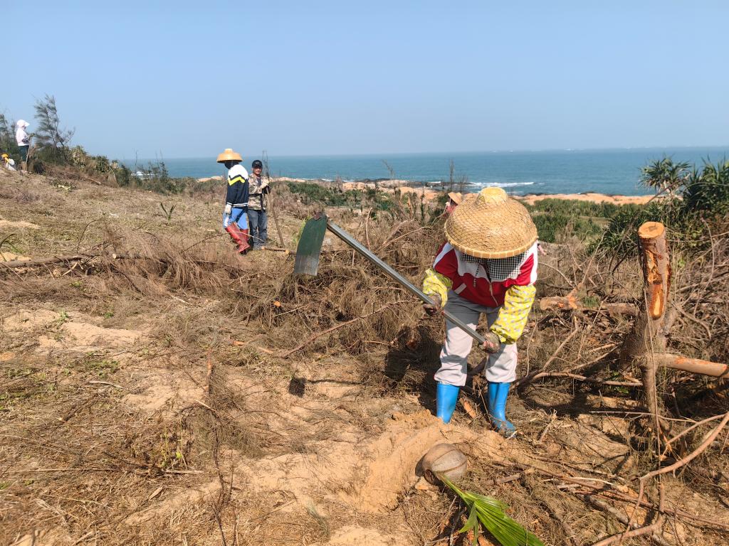 "dibandingkan dengan pohon casuarine asli, pohon kelapa tidak hanya tahan angin, tetapi juga lebih indah." Pekerja Han Jiyan menyeka keringatnya, lalu menyekop sekop tanah liat merah ke akar bibit kelapa yang baru ditanam, dan dengan lembut menepuknya untuk memadatkannya. He said: "This coconut forest needs to be planted 280 acres. We work for eight or nine hours a day and will be planted in these few days."