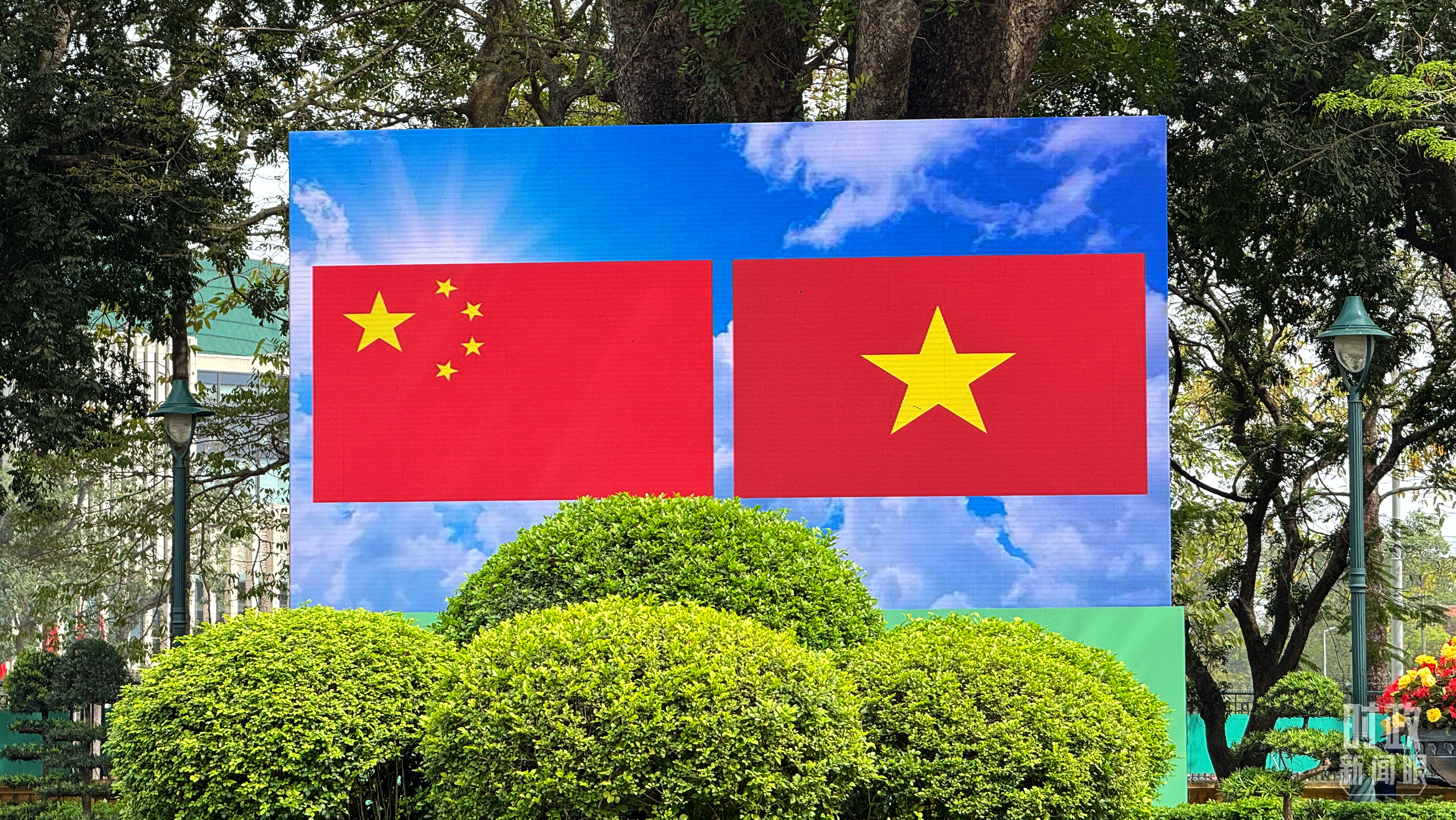 △欢迎仪式现场大屏幕上展示的中越两国国旗。(总台央视记者蒋硕拍摄)