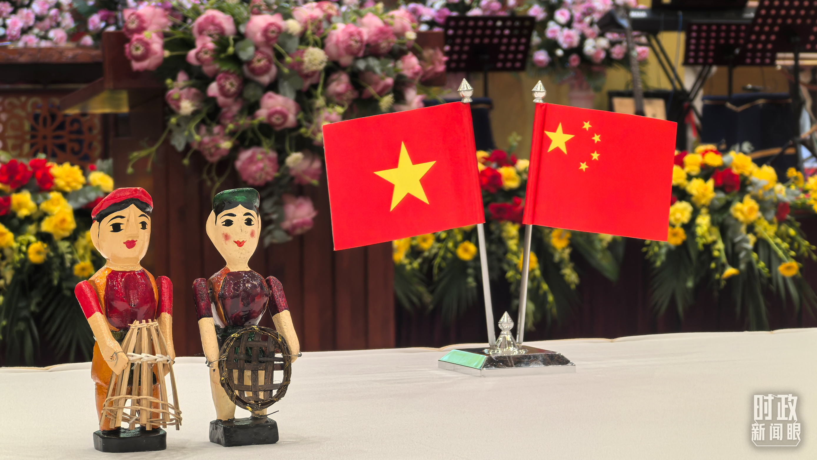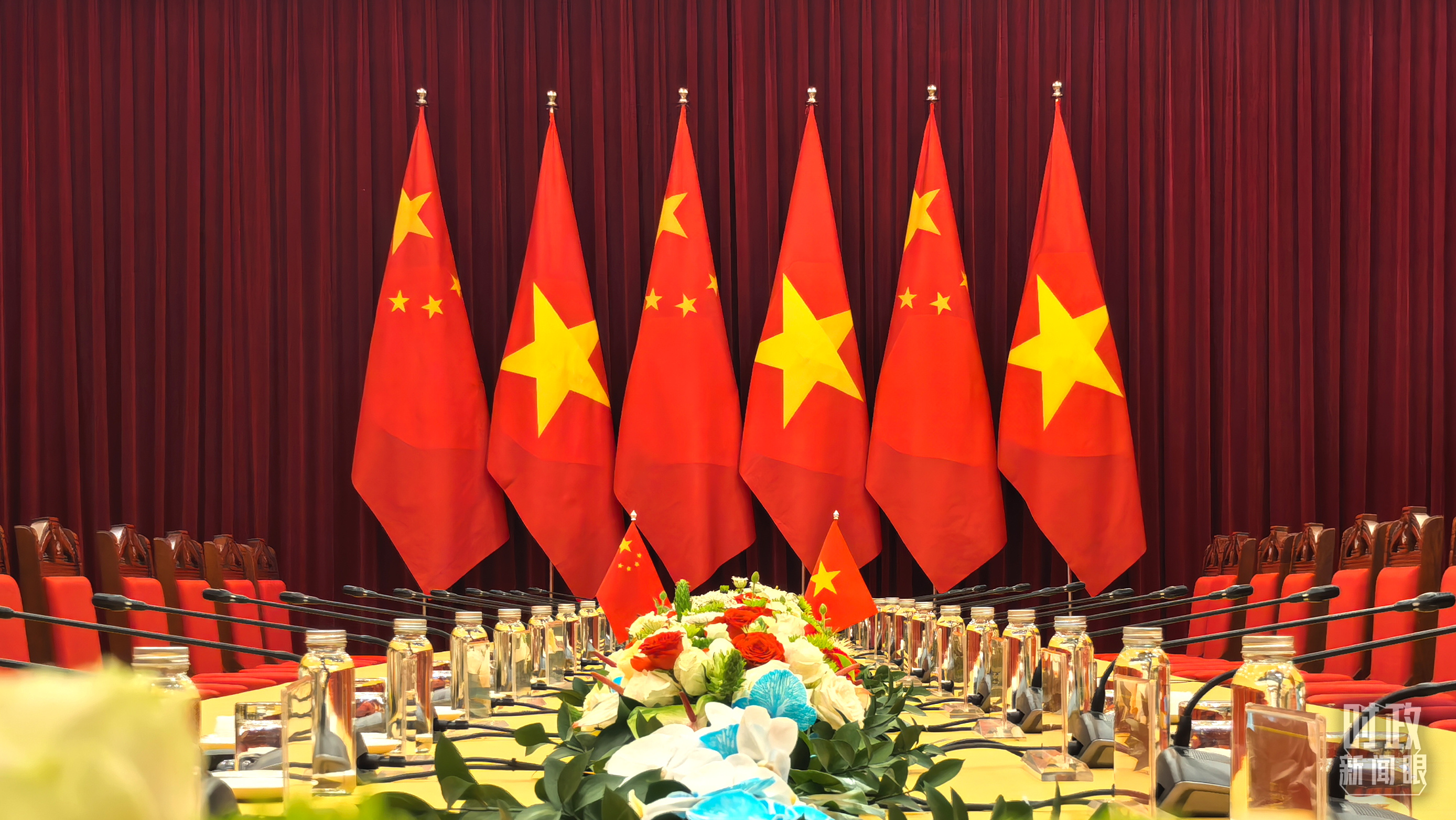 △欢迎宴会现场摆放的中越两国国旗。(总台央视记者鄂介甫拍摄)