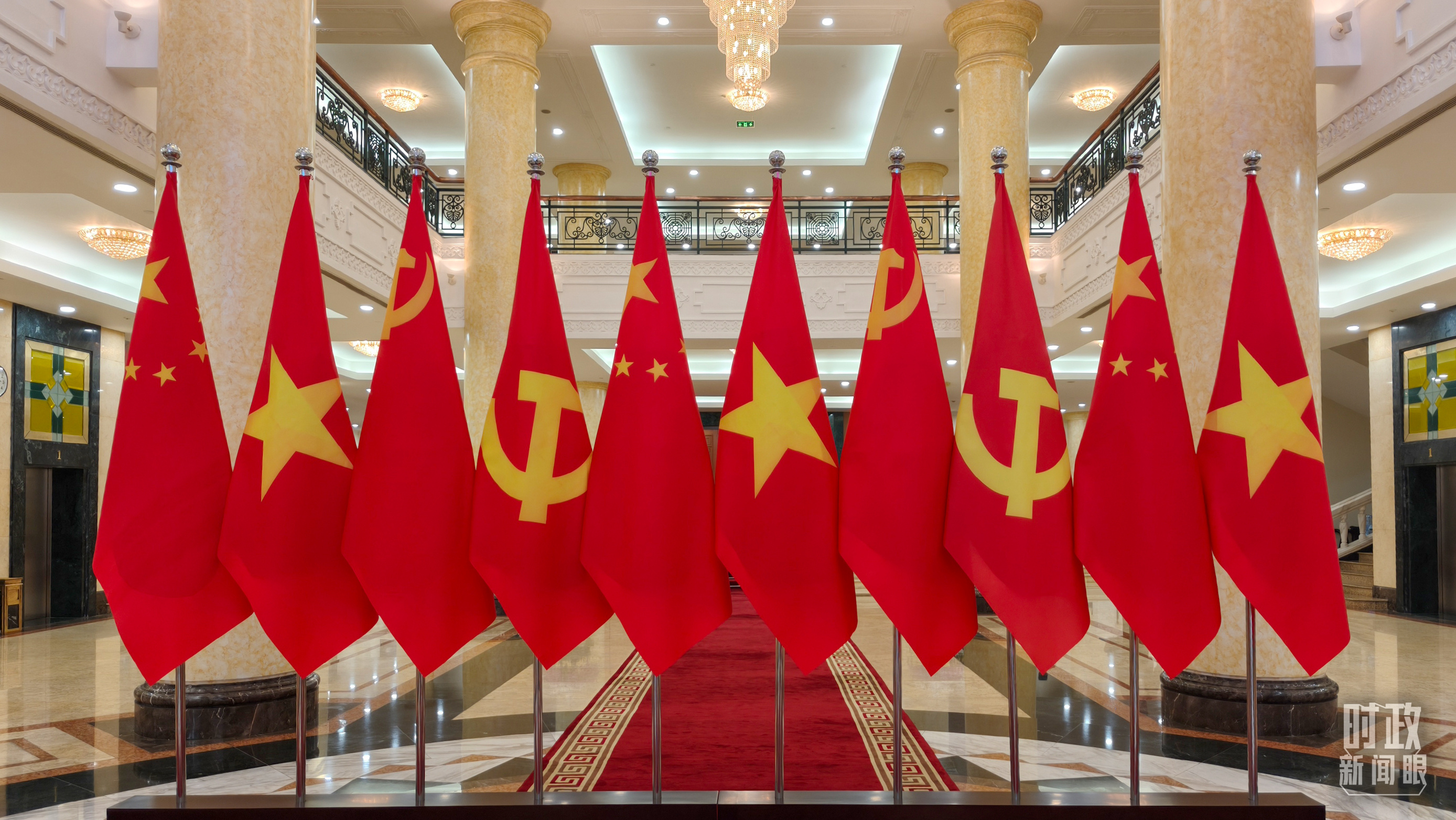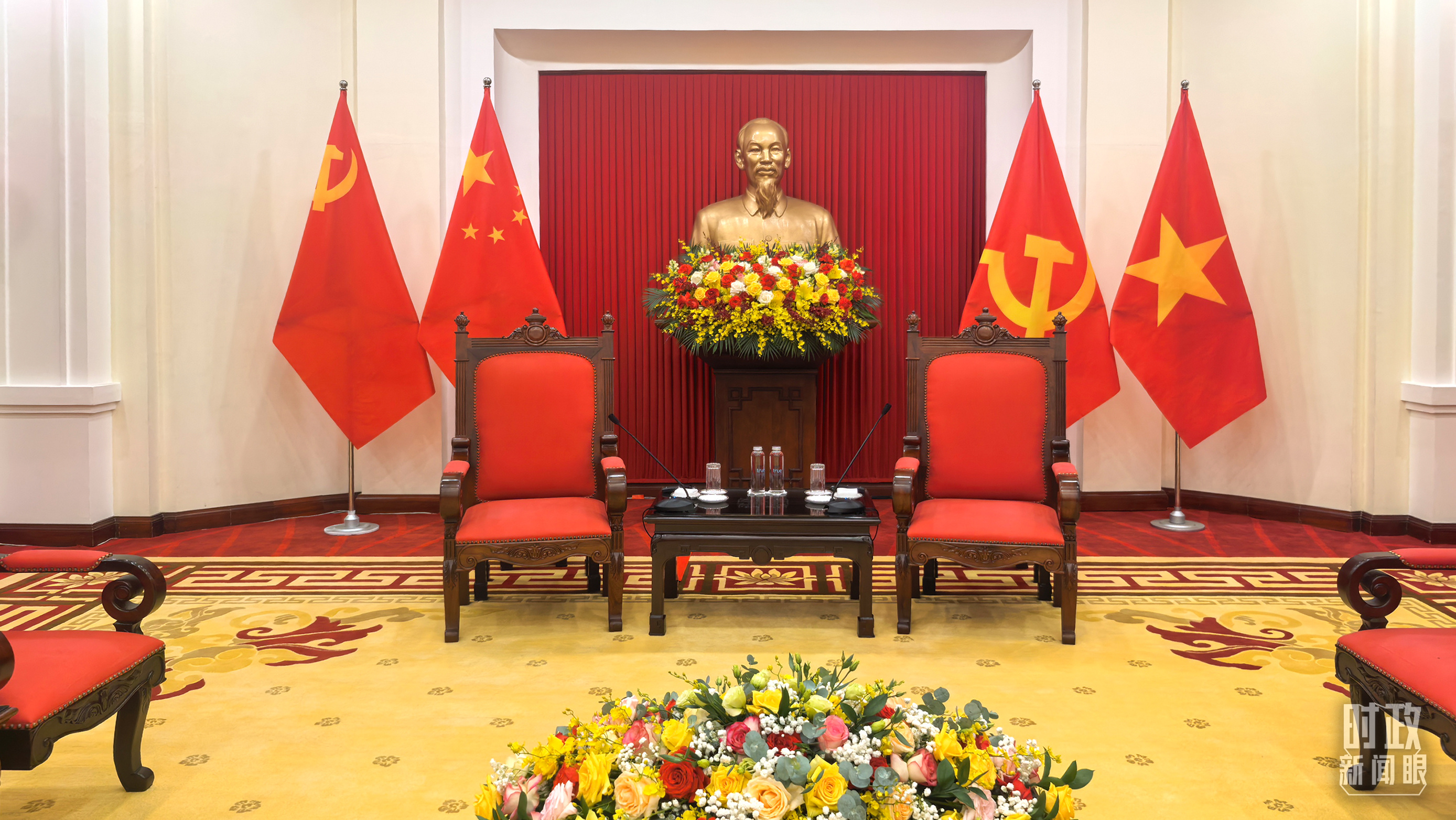 △越共中央驻地摆放的中越两党两国旗帜。(总台央视记者杨立峰拍摄)