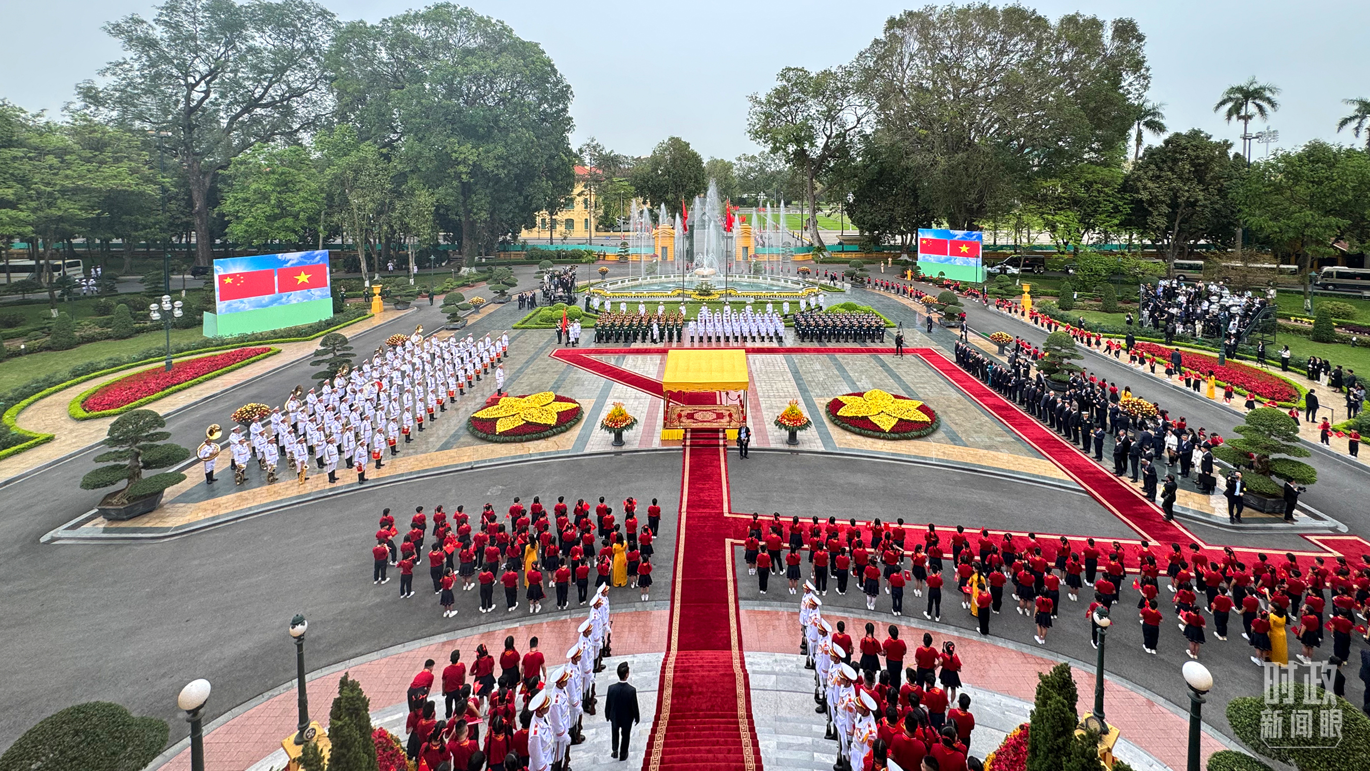 欢迎仪式上,200多名越南少年儿童挥舞旗帜,热烈欢迎习近平总书记到访。孩子们簇拥着两党总书记合影留念。全体仪仗队员在接受检阅时用越南语高呼“祝总书记身体健康”。