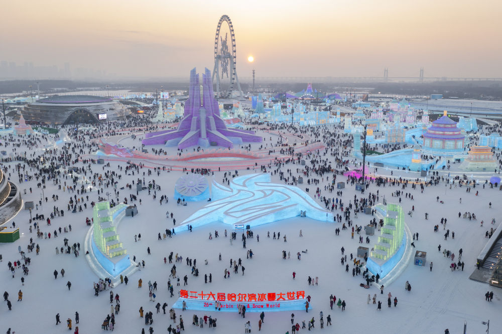 游客在哈尔滨冰雪大世界园区内游玩(无人机照片)。新华社记者谢剑飞 摄